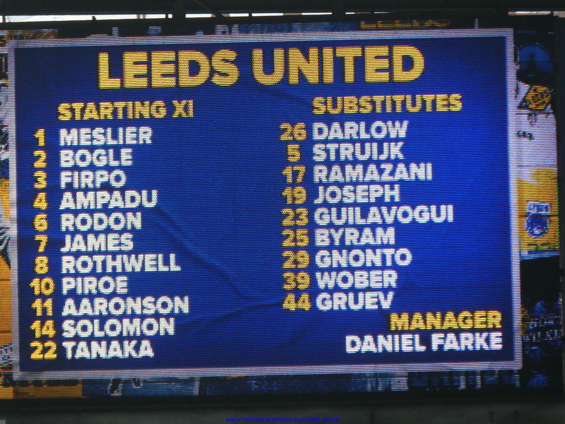 Team: Meslier, Ampadu, Rodon, Bogle, Firpo, James, Aaronson, Piroe, Solomon, Tanaka, Rothwell.