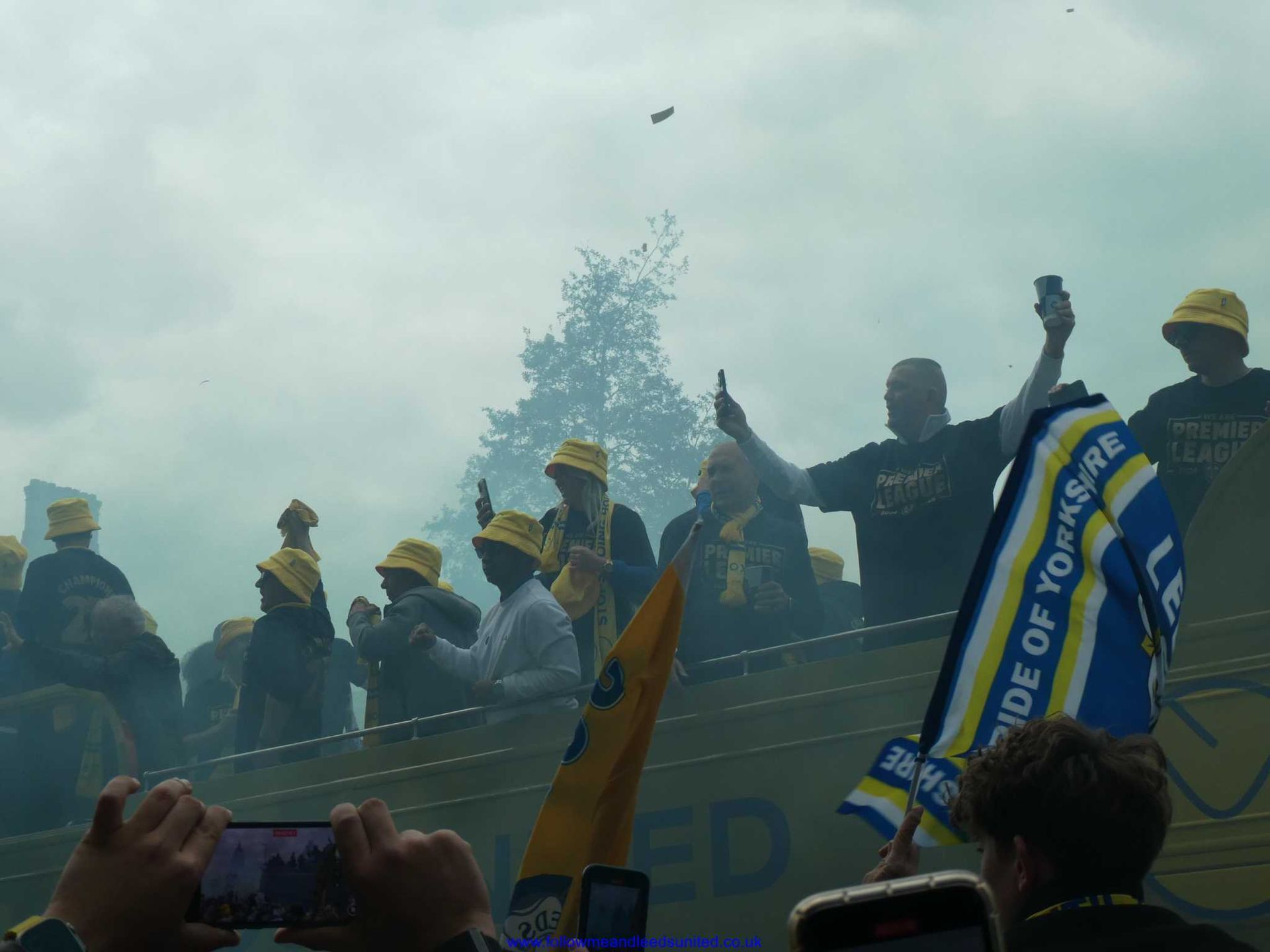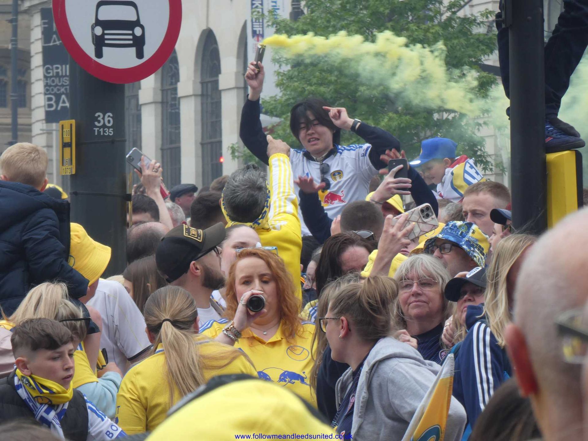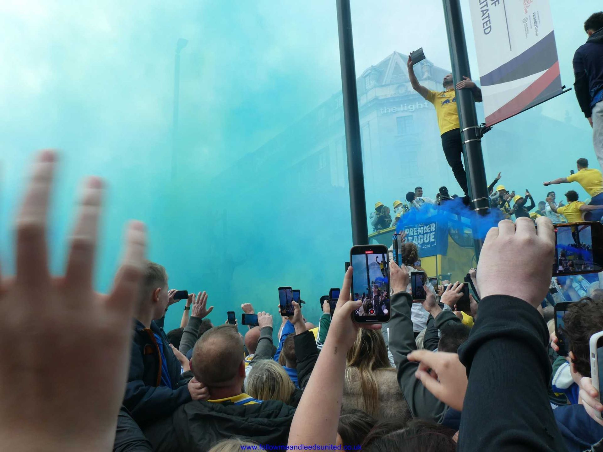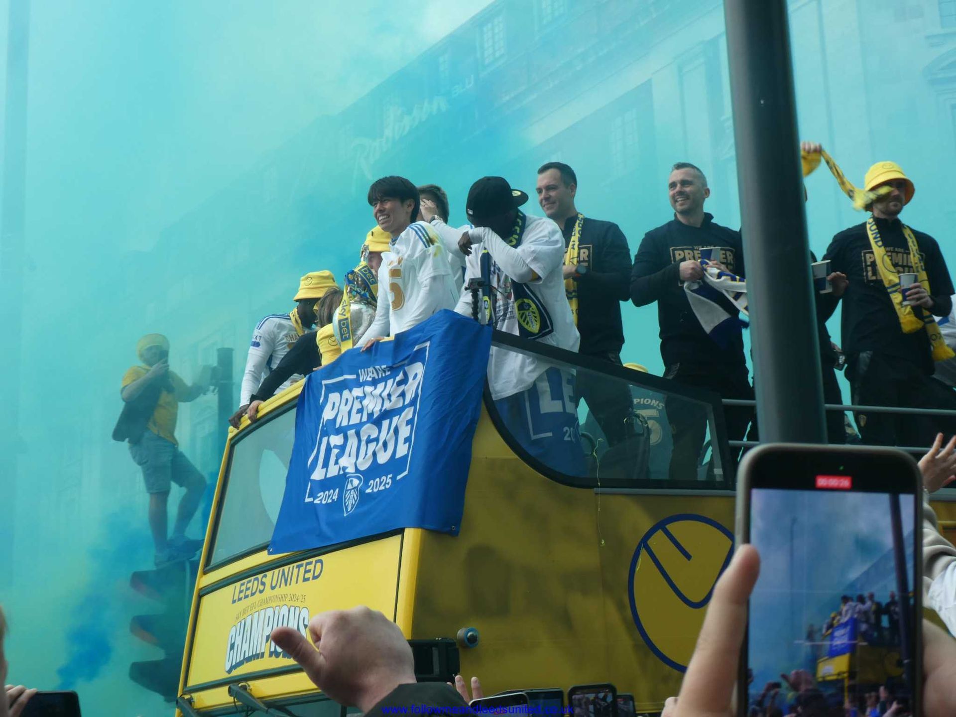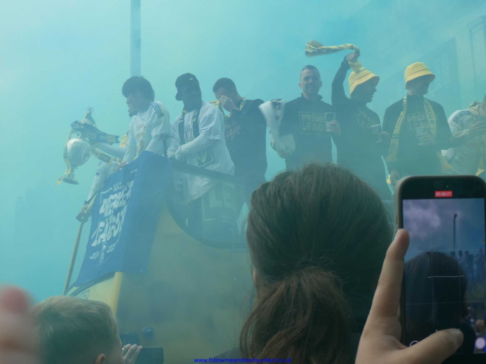 What a day. First of all, a BBC Radio Leeds interview at 7.10am, then a trip to Selby market to get our Doubtfires ice cream before heading to Leeds to the Champions parade. We managed to park up and aimed to go and meet the rest of the family on Boar Lane. Well, that was the intention, but we got as far as City Square and couldn’t get near enough to cross the road to the other side. We decided to head back to the Headrow then but in hindsight, maybe should have headed towards Wellington Street. We’d heard trains weren’t stopping to pick fans up on their way to Leeds as the trains were full, so it wasn’t unexpected that it was so packed everywhere. It was a good atmosphere and party mood but by the time the three open topped buses arrived two hours later where we were, everyone was frozen. There was so much smoke from the flares that we could hardly see the players which was a shame. The good thing was meeting up with other Leeds fans as we headed to Millennium Square. Whilst I went into Wetherspoons, a tree broke and a lad fell out of it. A crowd round him immediately and the police arrived but I saw him stood up surrounded by them, so we left. Conflicting stories are being heard but hopefully all turns out well. I’ve also seen a video of three people falling through a bus shelter roof so hopefully they aren’t too badly injured.