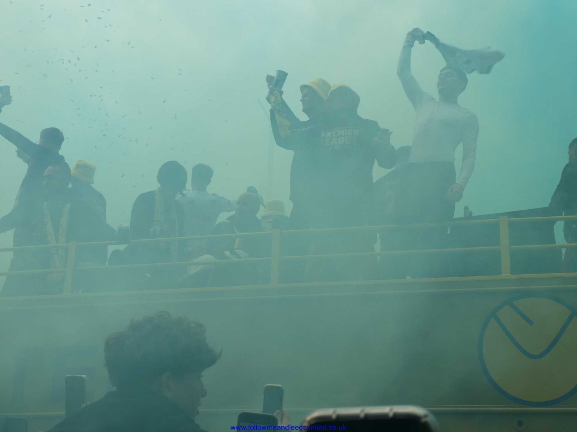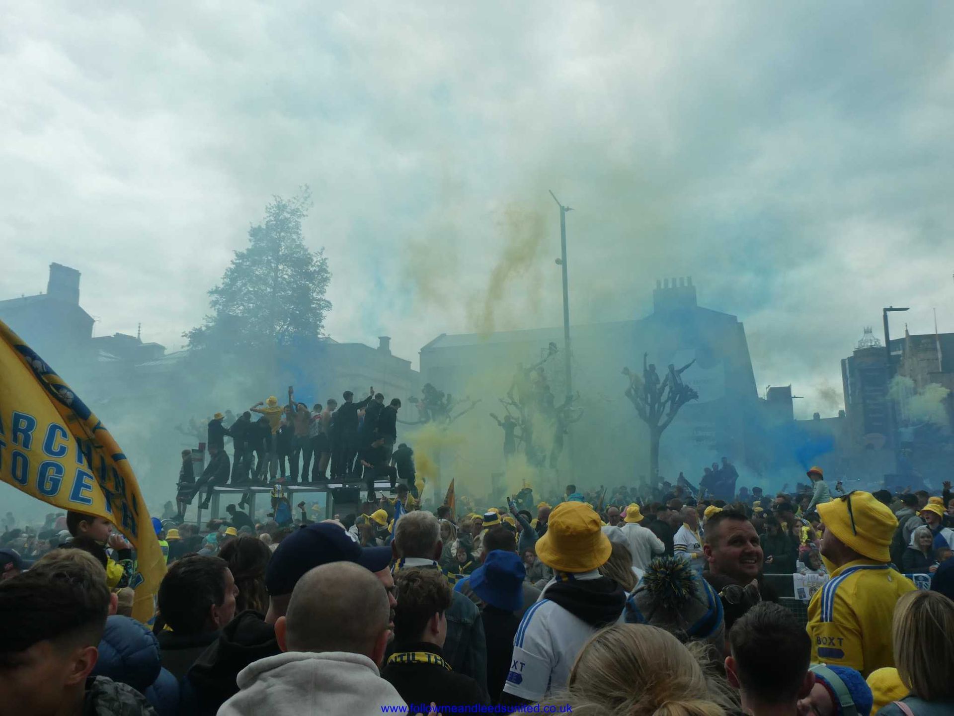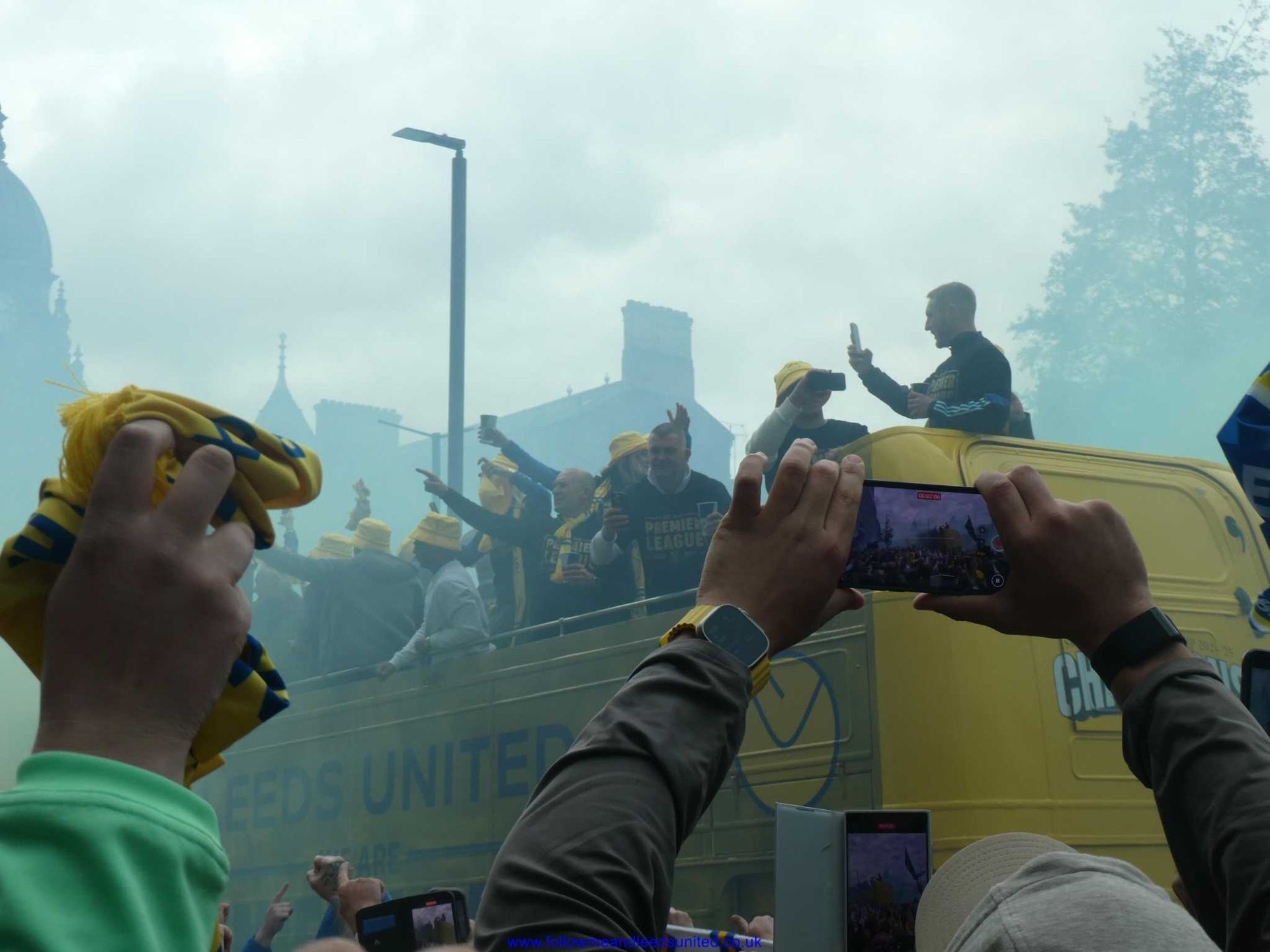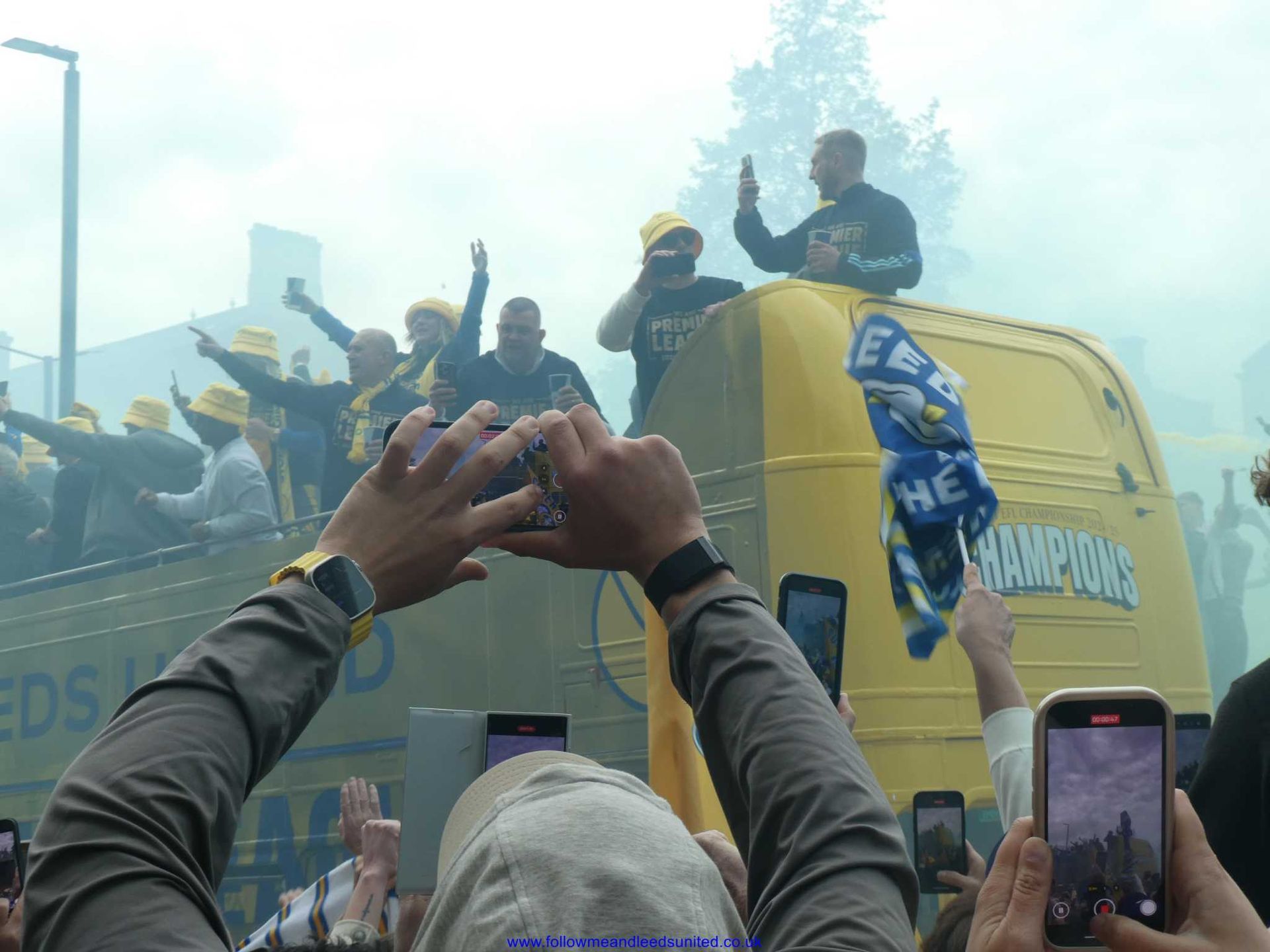 What a day. First of all, a BBC Radio Leeds interview at 7.10am, then a trip to Selby market to get our Doubtfires ice cream before heading to Leeds to the Champions parade. We managed to park up and aimed to go and meet the rest of the family on Boar Lane. Well, that was the intention, but we got as far as City Square and couldn’t get near enough to cross the road to the other side. We decided to head back to the Headrow then but in hindsight, maybe should have headed towards Wellington Street. We’d heard trains weren’t stopping to pick fans up on their way to Leeds as the trains were full, so it wasn’t unexpected that it was so packed everywhere. It was a good atmosphere and party mood but by the time the three open topped buses arrived two hours later where we were, everyone was frozen. There was so much smoke from the flares that we could hardly see the players which was a shame. The good thing was meeting up with other Leeds fans as we headed to Millennium Square. Whilst I went into Wetherspoons, a tree broke and a lad fell out of it. A crowd round him immediately and the police arrived but I saw him stood up surrounded by them, so we left. Conflicting stories are being heard but hopefully all turns out well. I’ve also seen a video of three people falling through a bus shelter roof so hopefully they aren’t too badly injured.