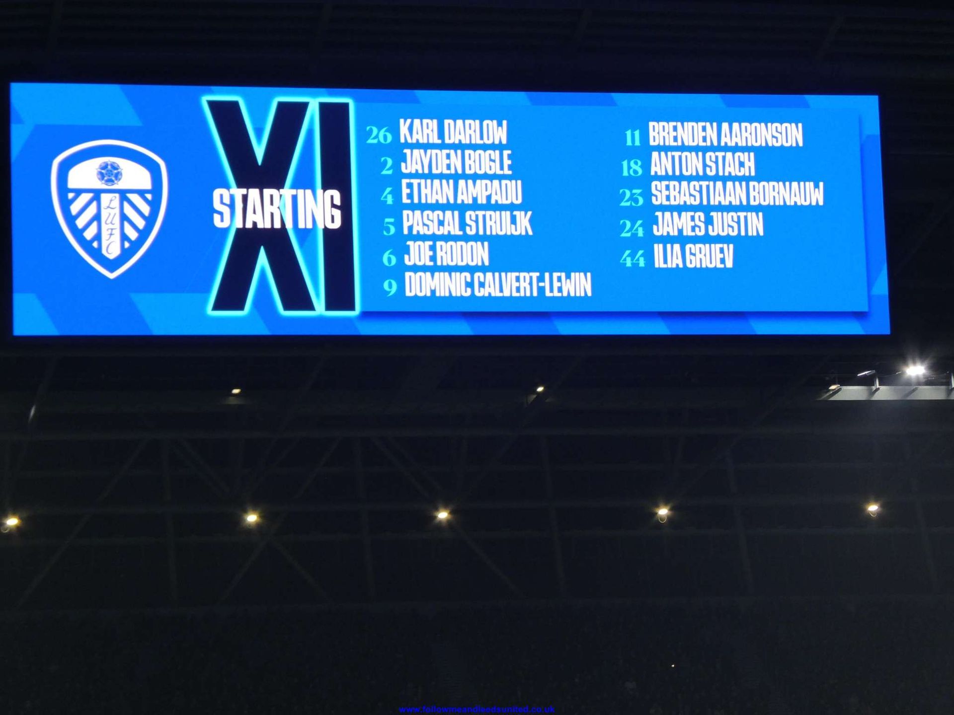 Team: Darlow, Ampadu, Rodon, Bogle, Calvert-Lewin, Aaronson, Gruev, Struijk, Justin, Stach, Bornauw.