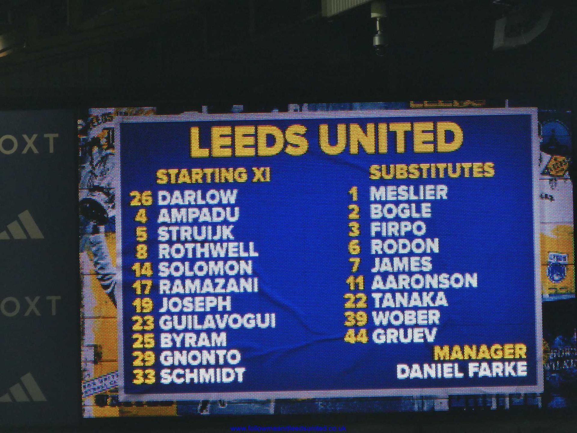 Team: Darlow, Struijk, Ampadu, Ramazani, Solomon, Gnonto, Joseph, Rothwell, Byram, Schmidt, Guilavogui.