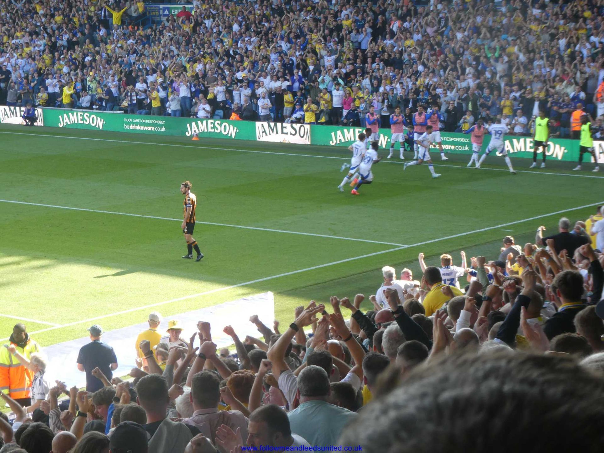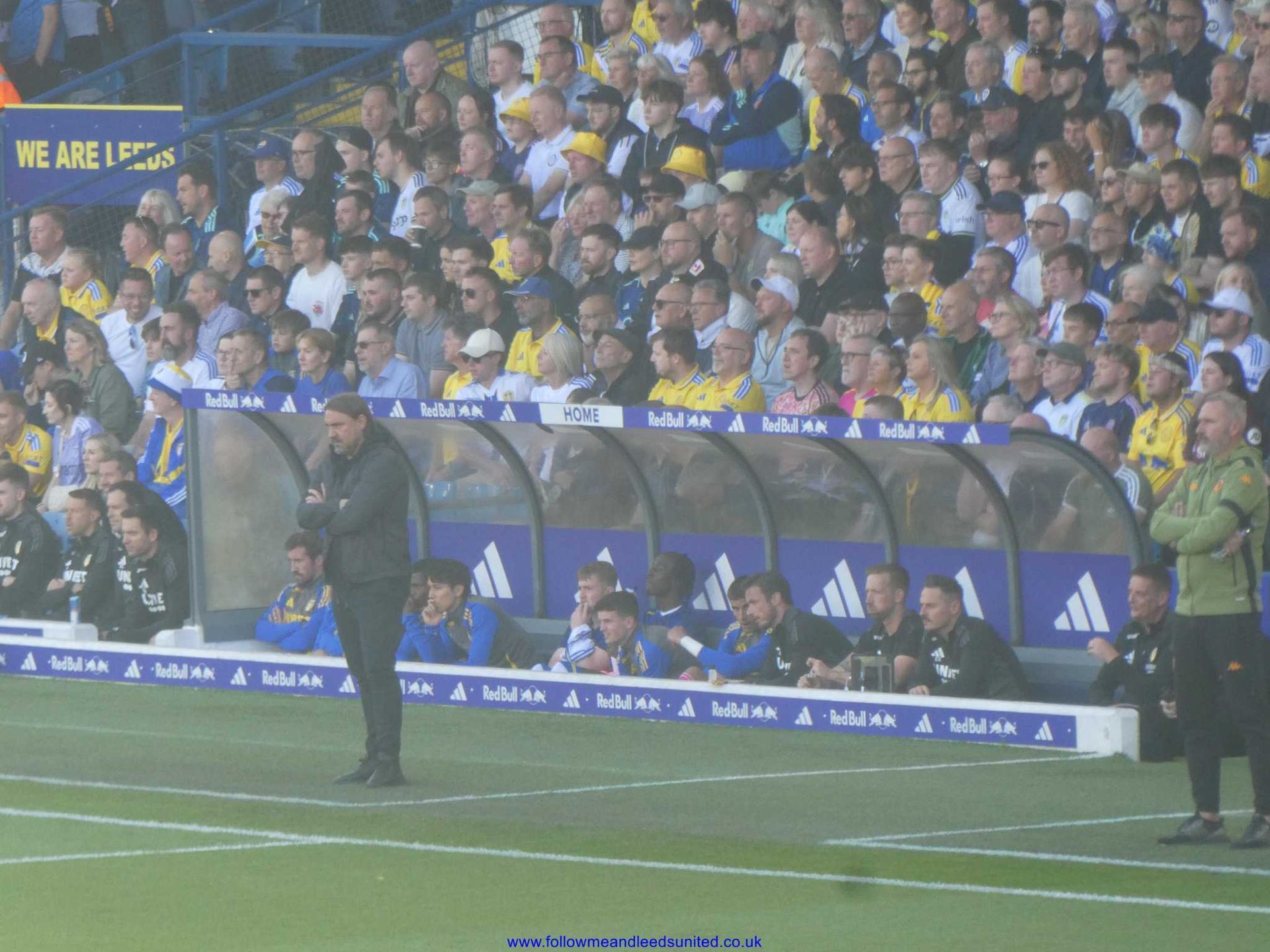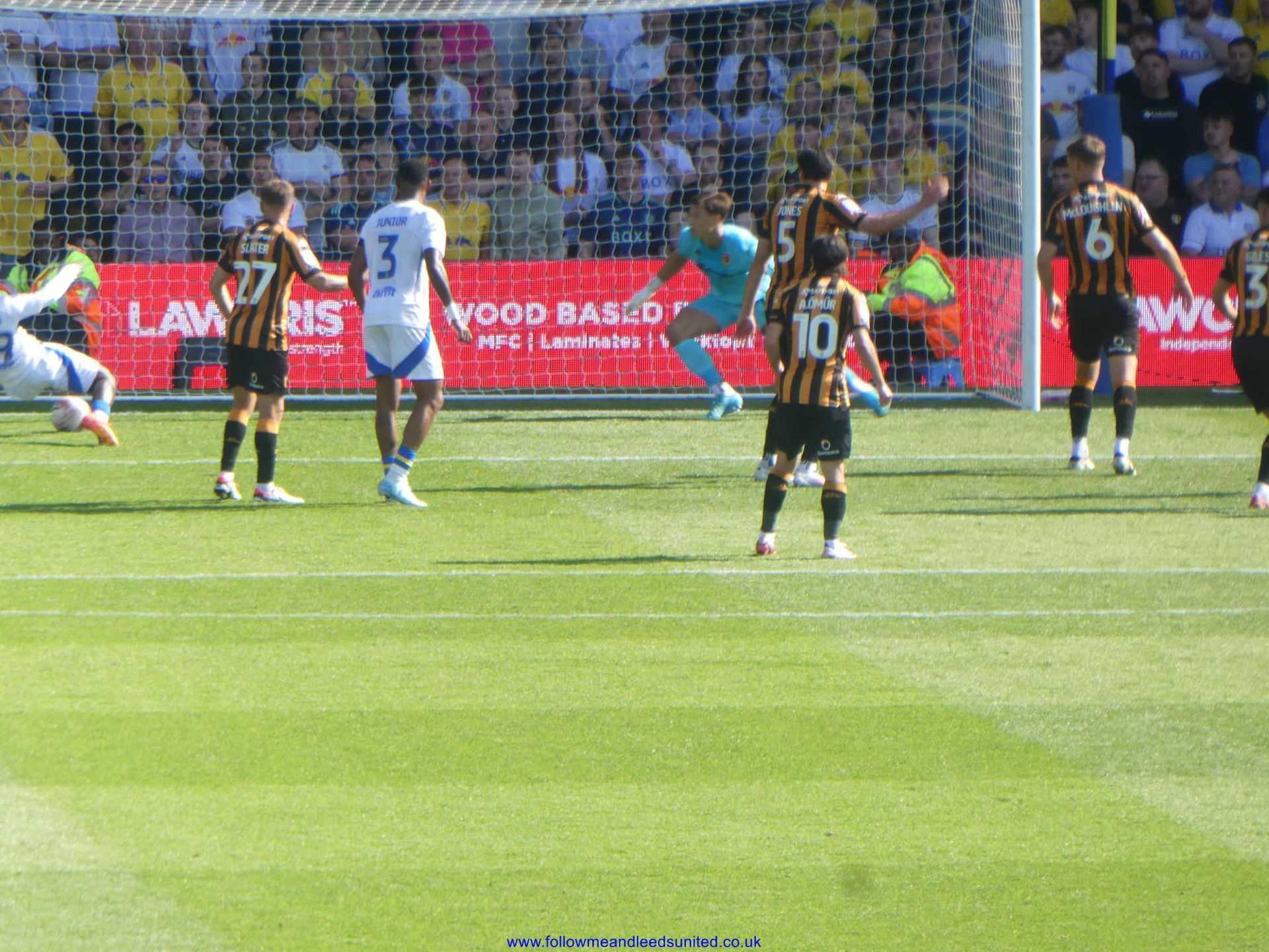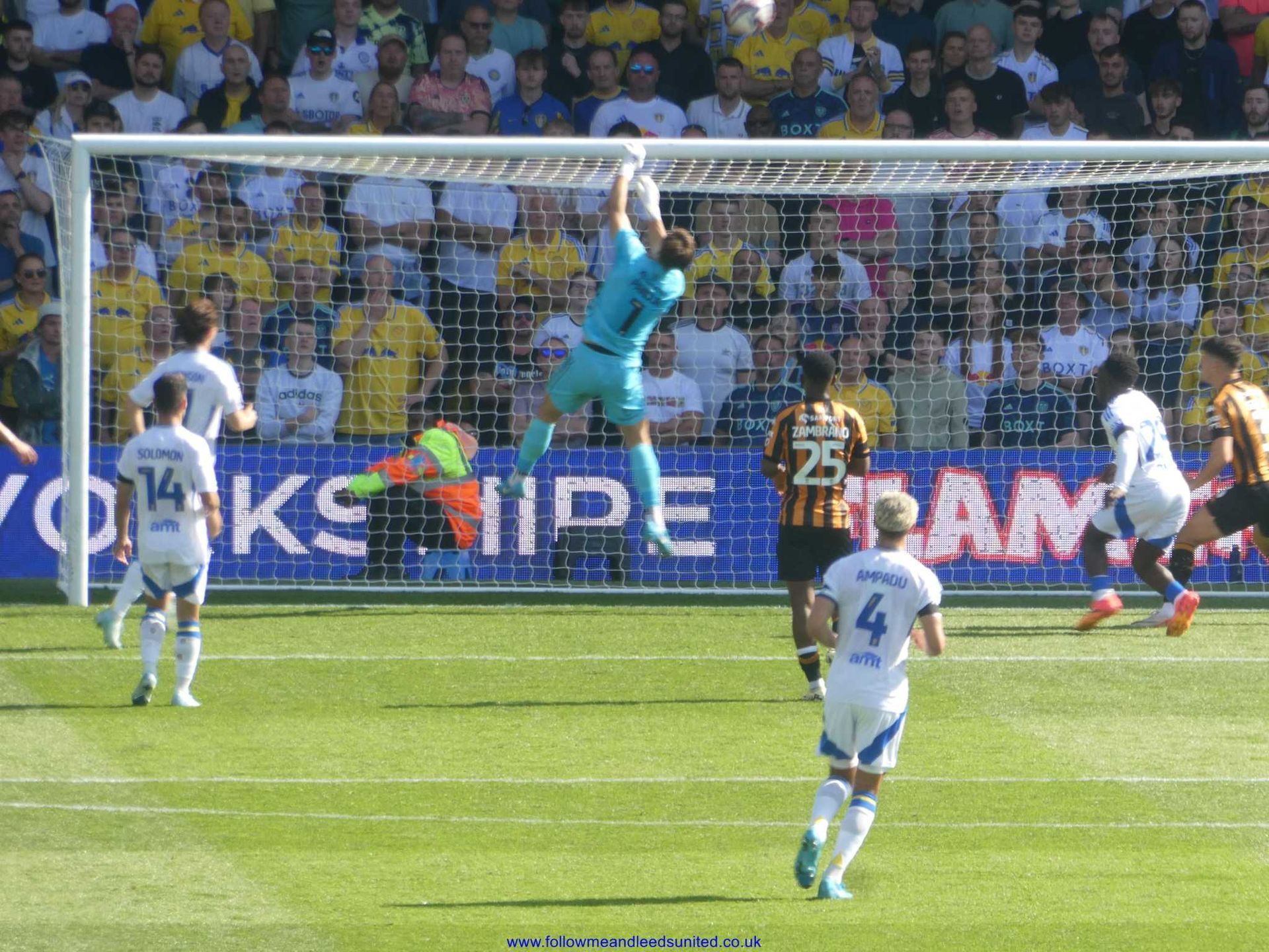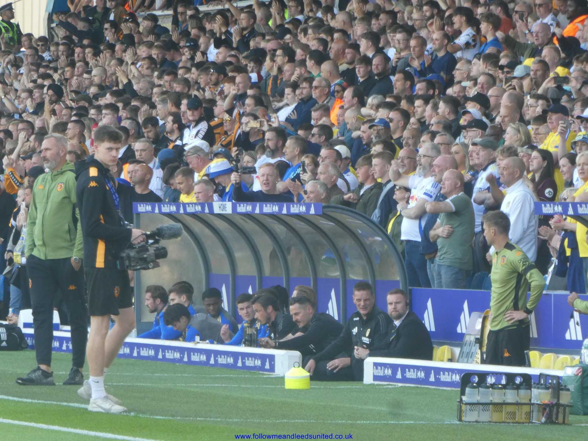 The game started at a fast pace with Leeds on the attack with Gruev’s low shot saved comfortably by the keeper then Joseph’s shot pushed over the bar. Hull attacked in numbers and a wicked shot went just over Meslier’s crossbar. Leeds were unlucky not to take the lead when Gnonto put the ball into the net but was ruled offside. Hull came back with an immediate response and showed they could be dangerous on the break as they were in acres of space down the left-hand side of the Kop. Luckily for us we were able to keep the ball out although at times when bringing the ball out from the back, things got too close for comfort. To me the first half passed very quickly as we went into the break on equal terms. Saw Tony at half time and I love how he has changed the bulls to blue on the home shirt.