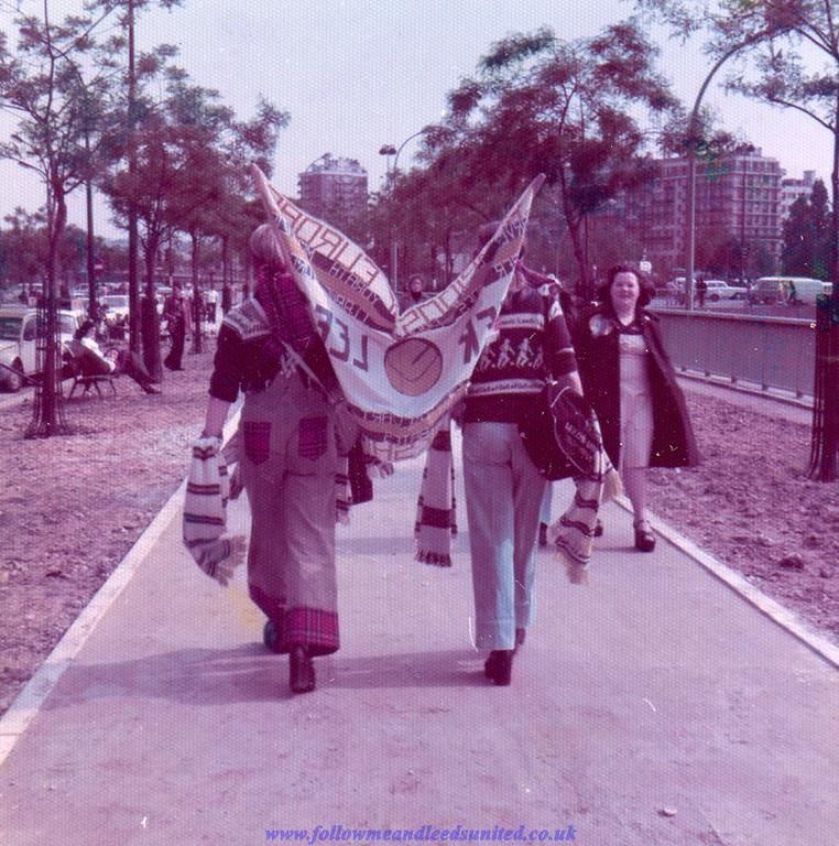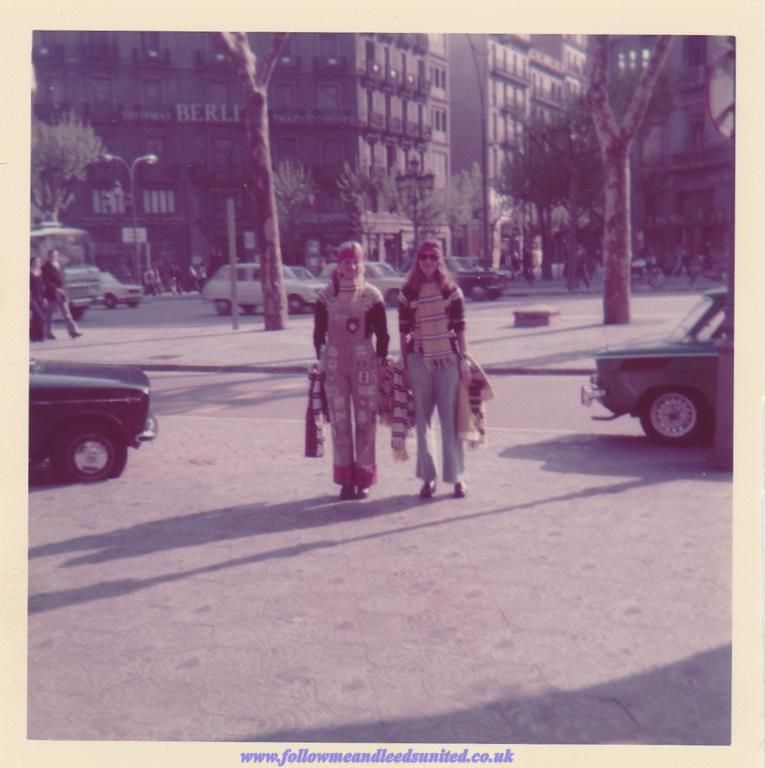 Barcelona European Cup 1975 Heidi and Sue with banners