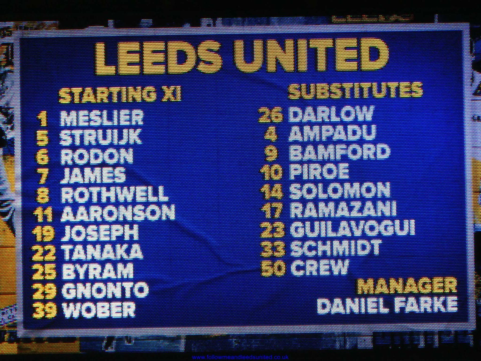 Team: Meslier, Struijk, James, Rodon, Joseph, Gnonto, Rothwell, Wöber, Aaronson, Tanaka, Byram.