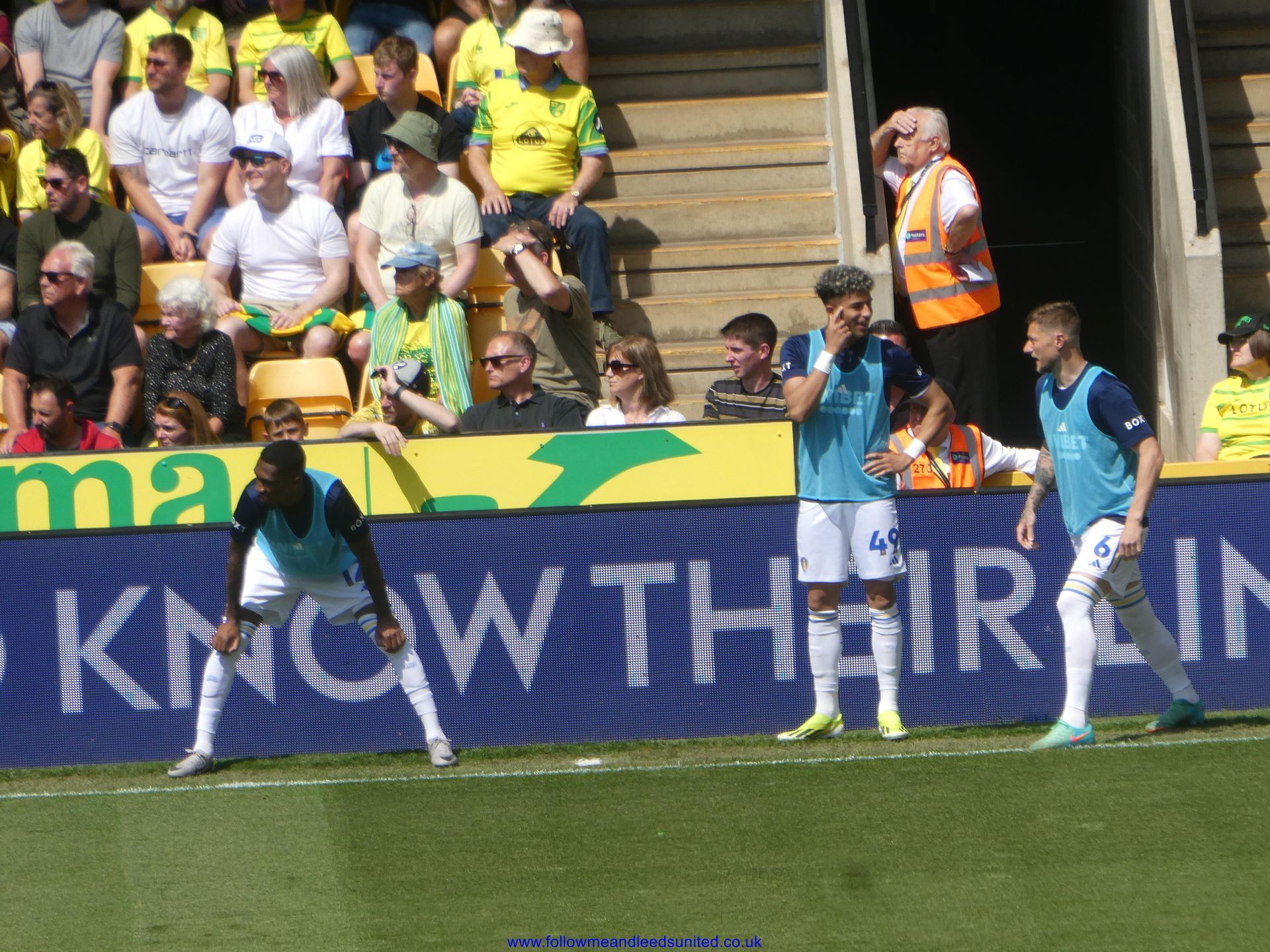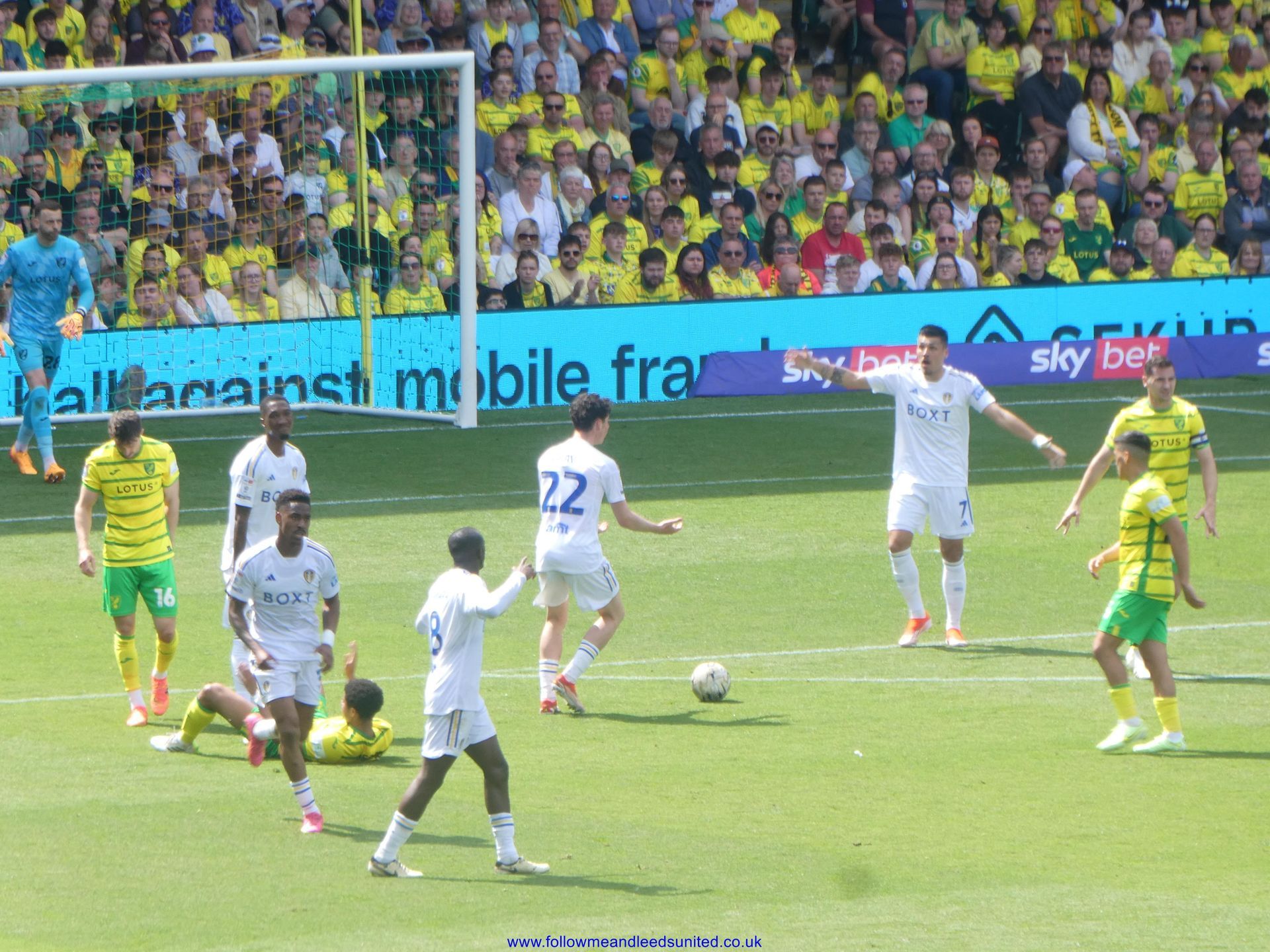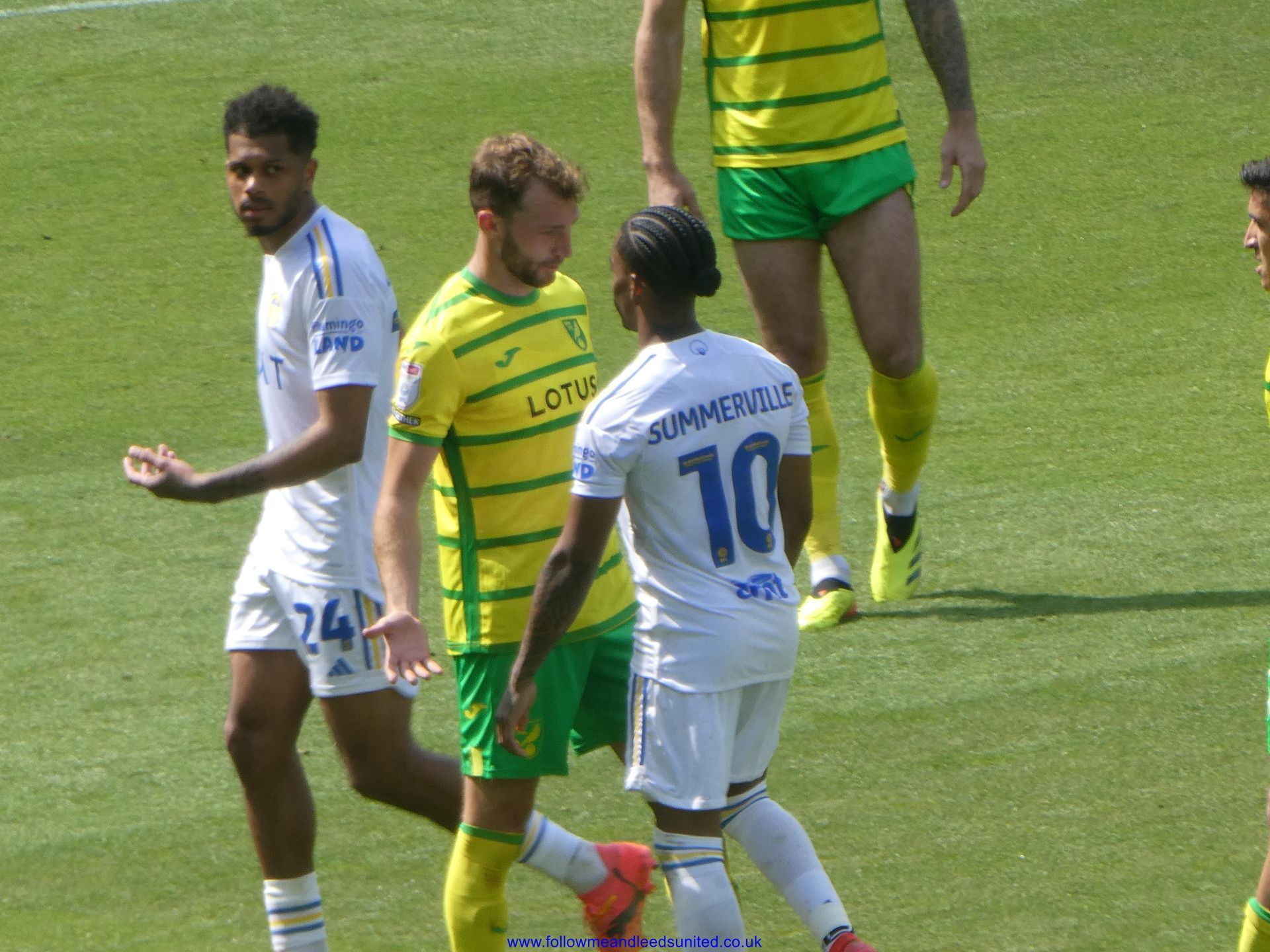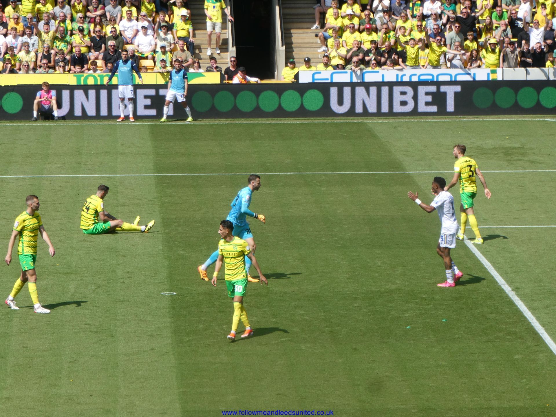 The second offside was way off but not given. With Norwich getting so many free kicks given for fouls, the referee came under fire from the Leeds fans especially as he’d played on when Gnonto was brought down on the edge of the box. Leeds did win a free kick and Summerville’s shot was put out for a corner. Gnonto had a good strike which was blocked and although Norwich had looked dangerous a few times, we went in on level terms at half time. The second half saw chances limited for both teams, but it was good to see the Leeds players find some fighting spirit again as it has been missing as of late.