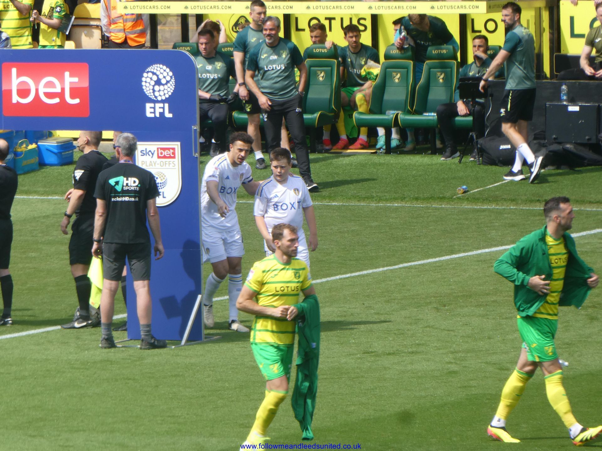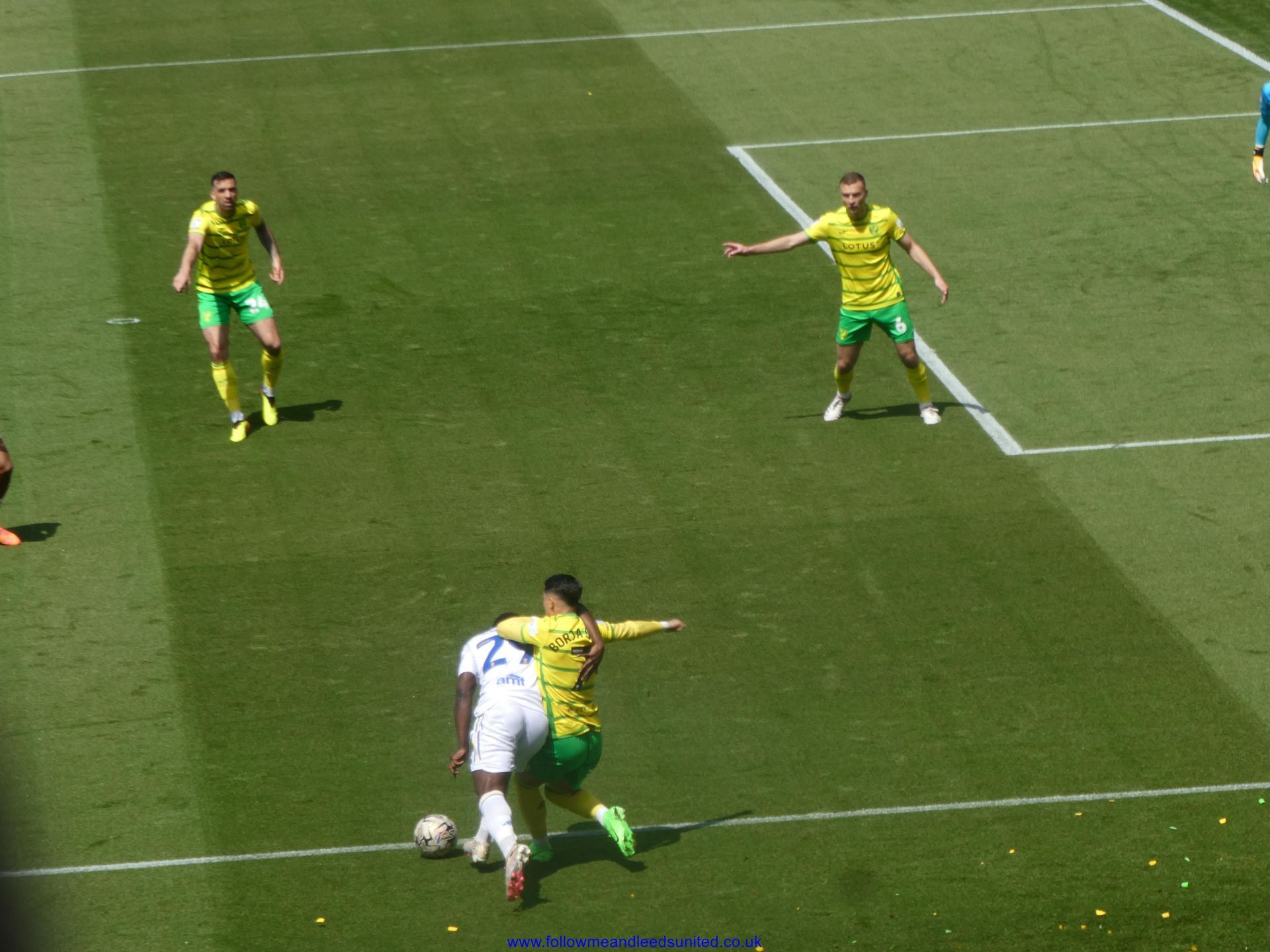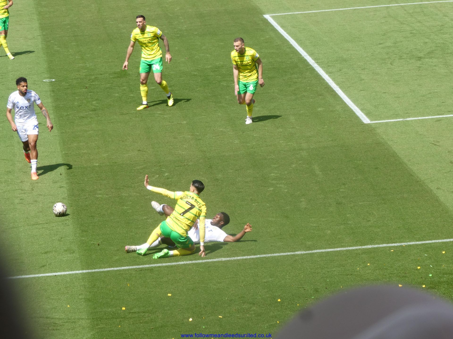 The second offside was way off but not given. With Norwich getting so many free kicks given for fouls, the referee came under fire from the Leeds fans especially as he’d played on when Gnonto was brought down on the edge of the box. Leeds did win a free kick and Summerville’s shot was put out for a corner. Gnonto had a good strike which was blocked and although Norwich had looked dangerous a few times, we went in on level terms at half time. The second half saw chances limited for both teams, but it was good to see the Leeds players find some fighting spirit again as it has been missing as of late.