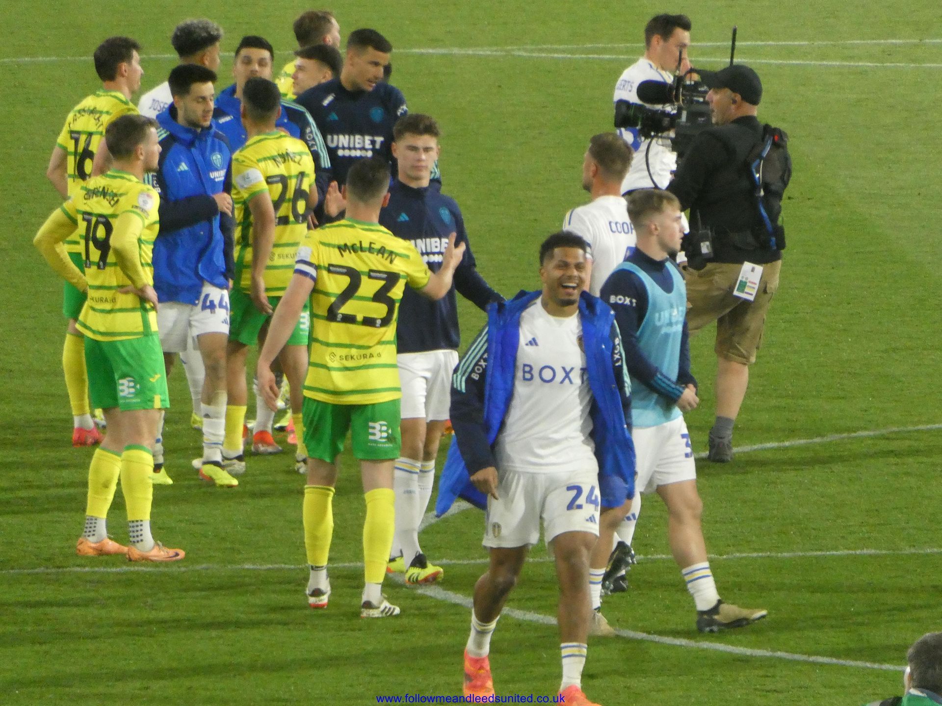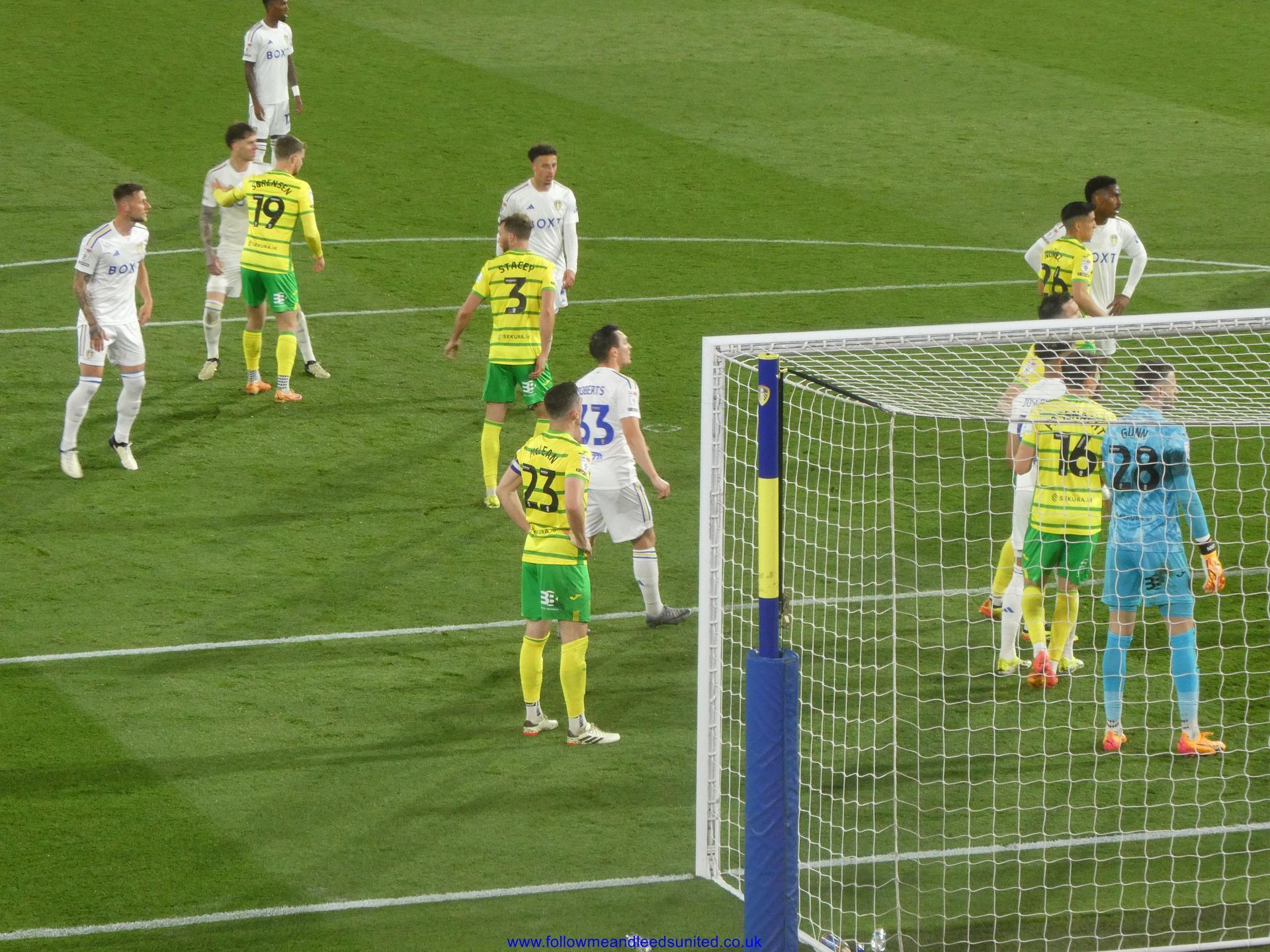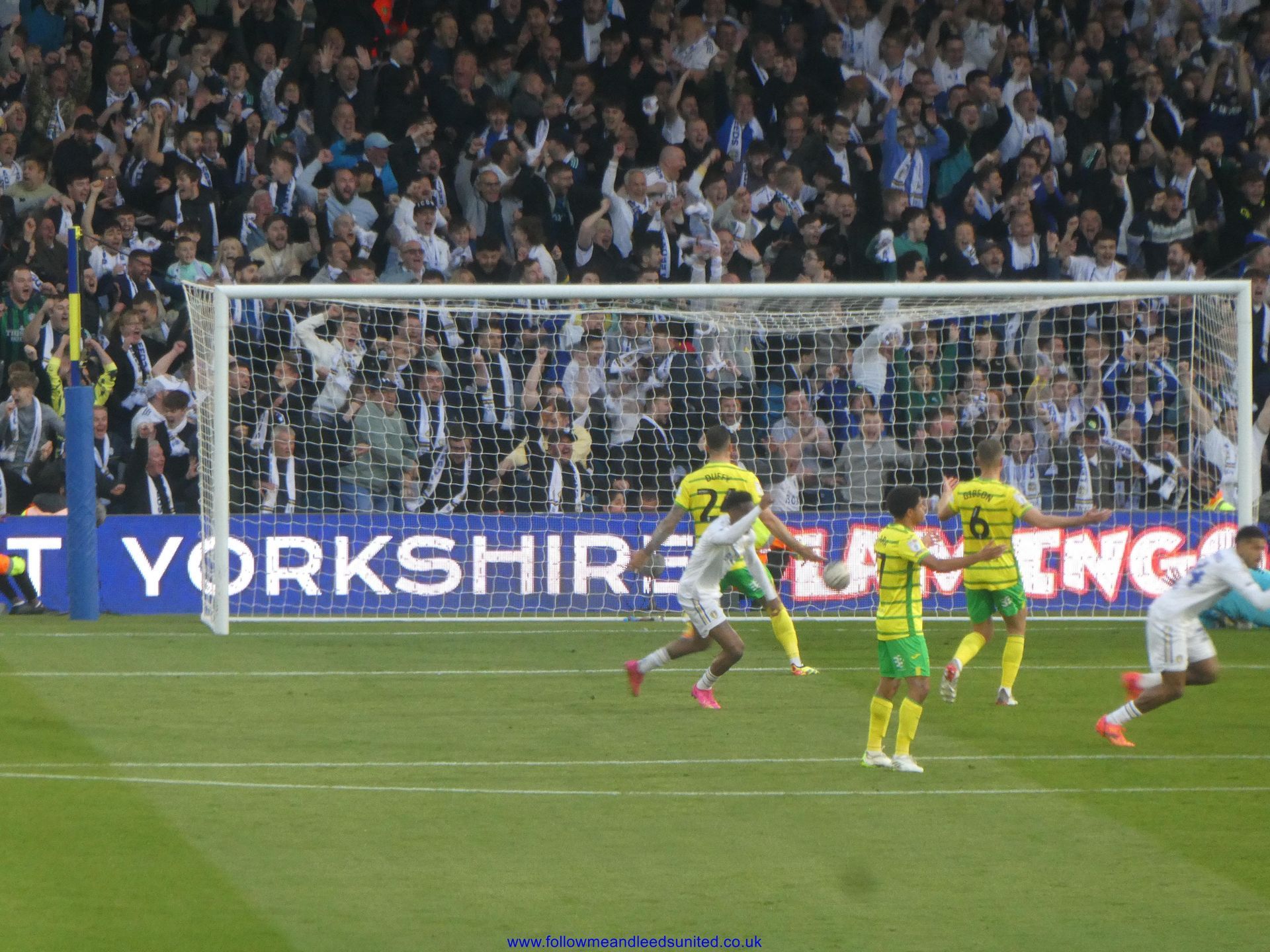With the fans on fire as well as an electric atmosphere, Leeds got off to a fantastic start when Gruev hit a free kick straight into the net to give us an early lead. Obviously, the lads had listened to my advice pregame telling them to shoot on sight! Some fantastic play from Gray who was playing right back, saw him send a great pass to Gnonto. He ran forward then sent a fantastic cross into the box and Piroe doubled our lead as Elland Road went wild. Norwich nearly got straight back into the game as they counter attacked and got the better of Ampadu and were clean through with only Meslier to beat. He pulled off a stunning save to keep Norwich out and maintain our two-goal lead. That was a vital save from Meslier as it would have given them a chance to get back into the game. Leeds weren’t finished there as Piroe and Summerville with some lovely play down the left hand side, saw Piroe run to the edge of the box, pass it into the middle where their defender under pressure from Summerville, passed the ball into the path of Rutter to send a fantastic rising shot into the net to give us a three goal lead in the first half. Rutter nearly got another but was kept out by Norwich as we went into the break three goals to the good.