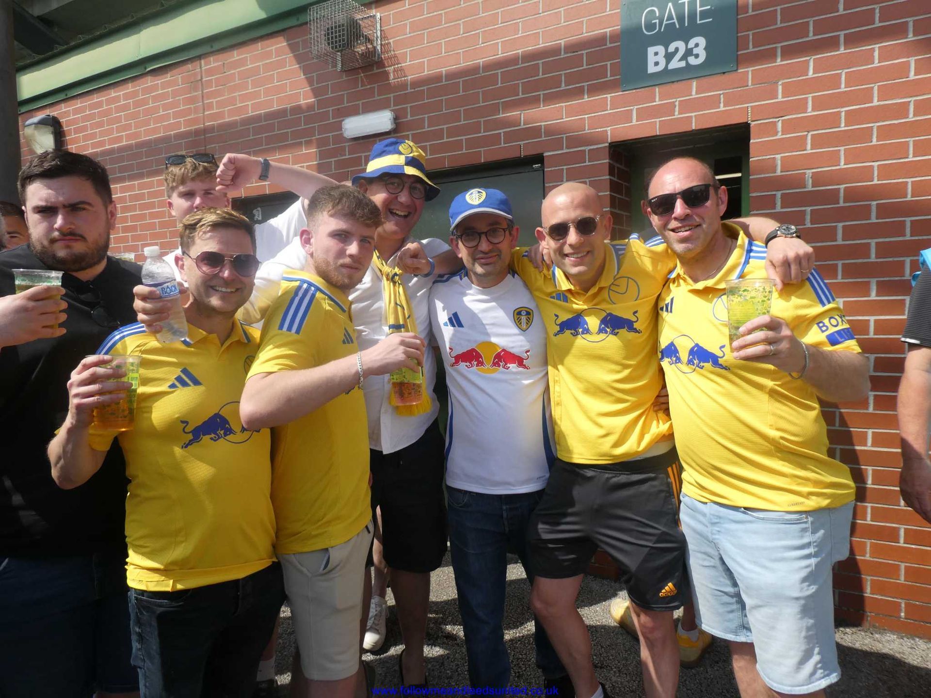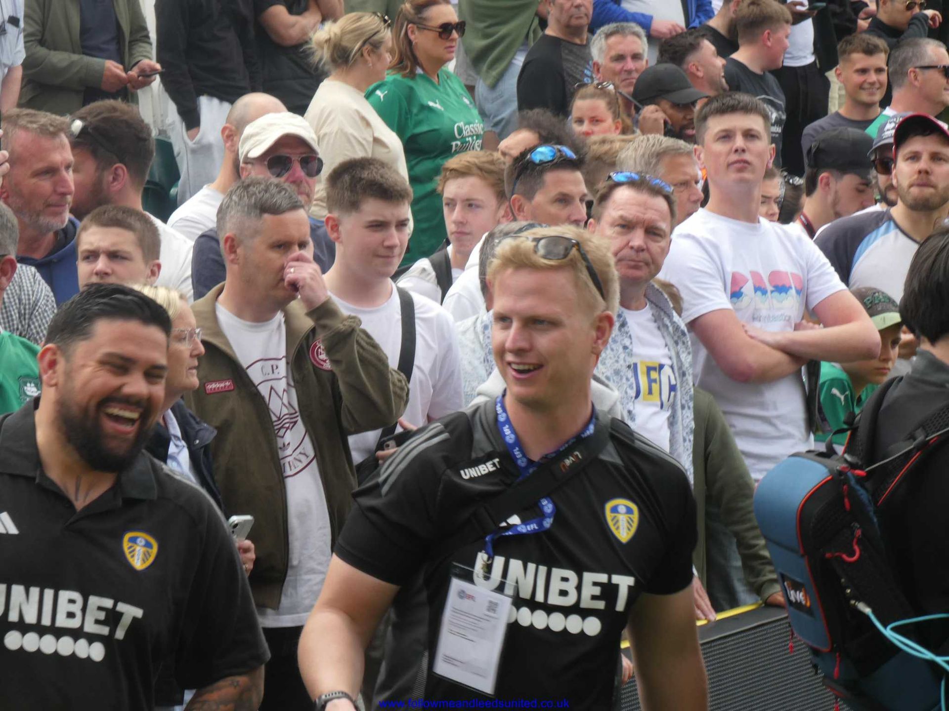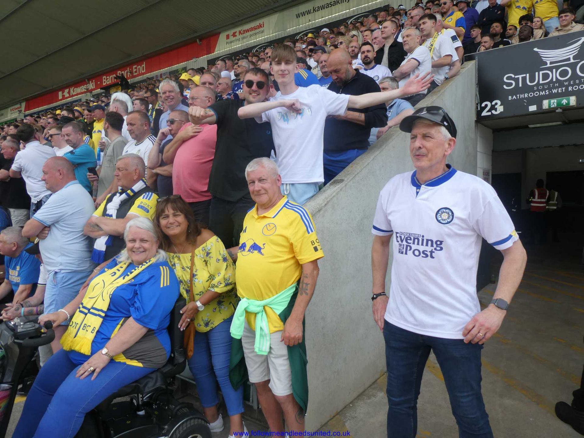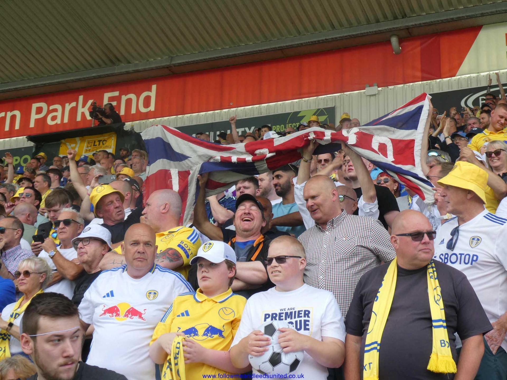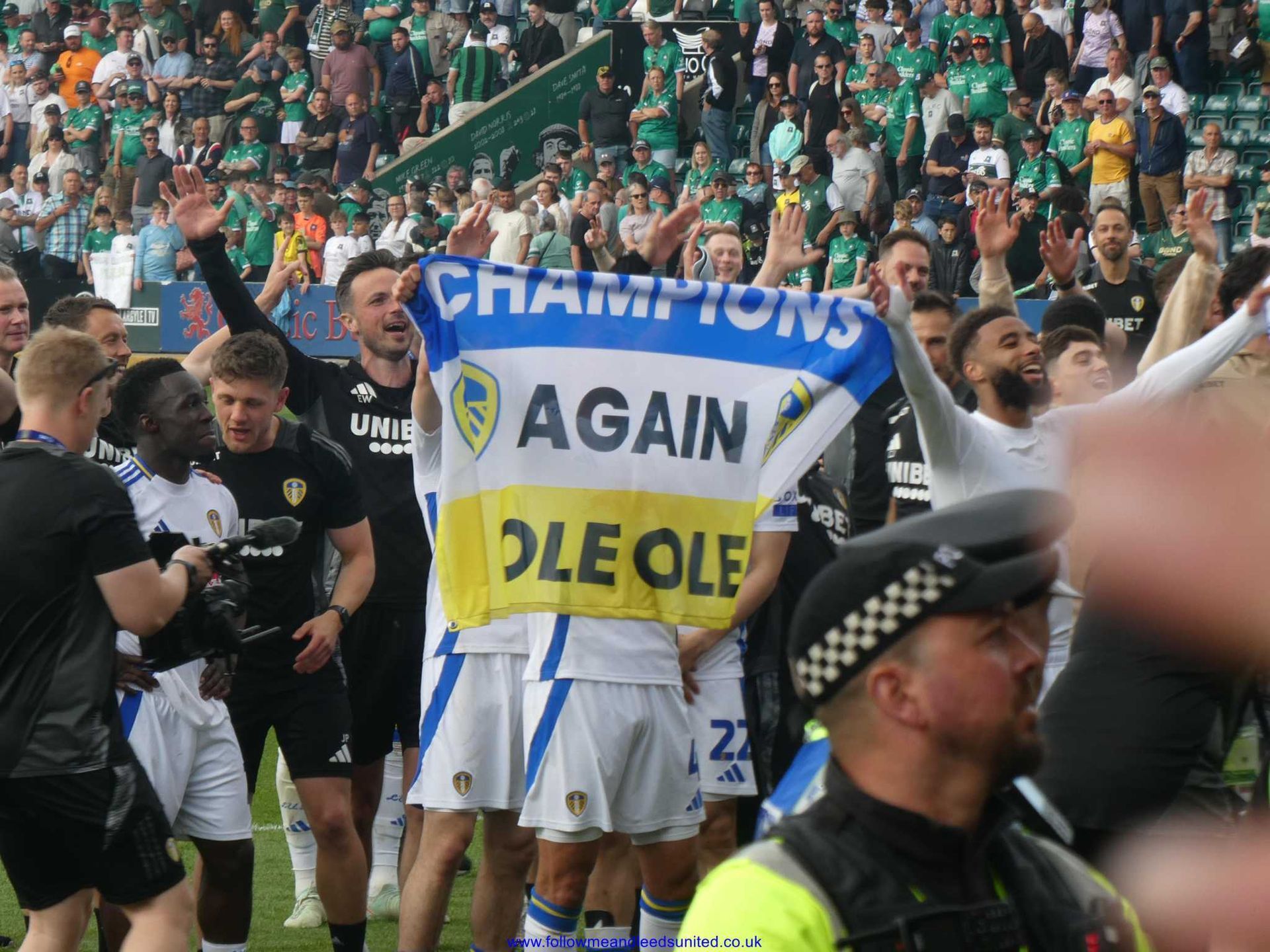 As the seconds ticked down, Plymouth had a couple of attacks giving us some anxious moments before the final whistle blew and everyone including the team went nuts. The songs rang out from the Leeds fans celebrating our promotion to the Premier League as Champions with an impressive 100 points. It turned out that Burnley had 100 points too, but our goal difference was far superior thank goodness. Tremendous, joyous scenes both on and off the pitch as the team went off before coming out again to be presented with the trophy. It turns out there was quite a gathering of Leeds fans in the stand to our left too. Happy, smiling and ecstatic Leeds fans although we couldn’t quite believe we had done it. Being able to celebrate the promotion with the team was brilliant because when we last won the league under Bielsa, we weren’t allowed to join in the celebrations due to covid. I’m not sure how long we all stayed in the ground celebrating but what a great feeling it was.