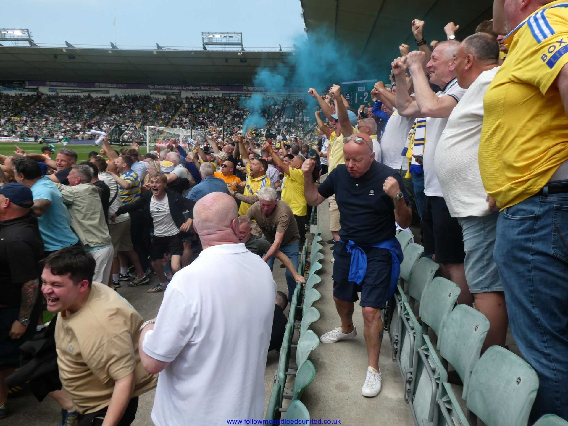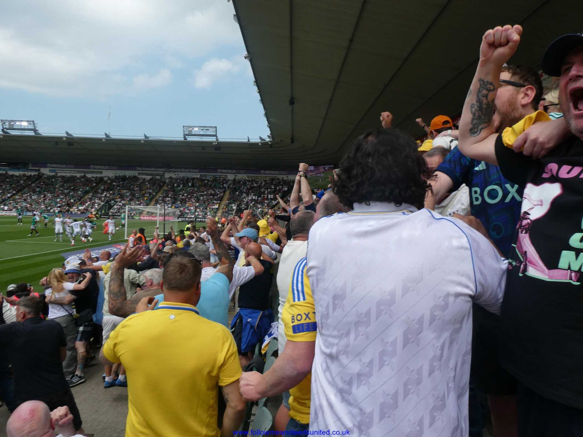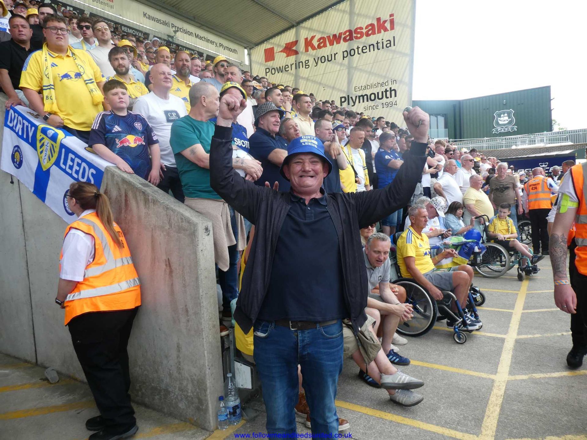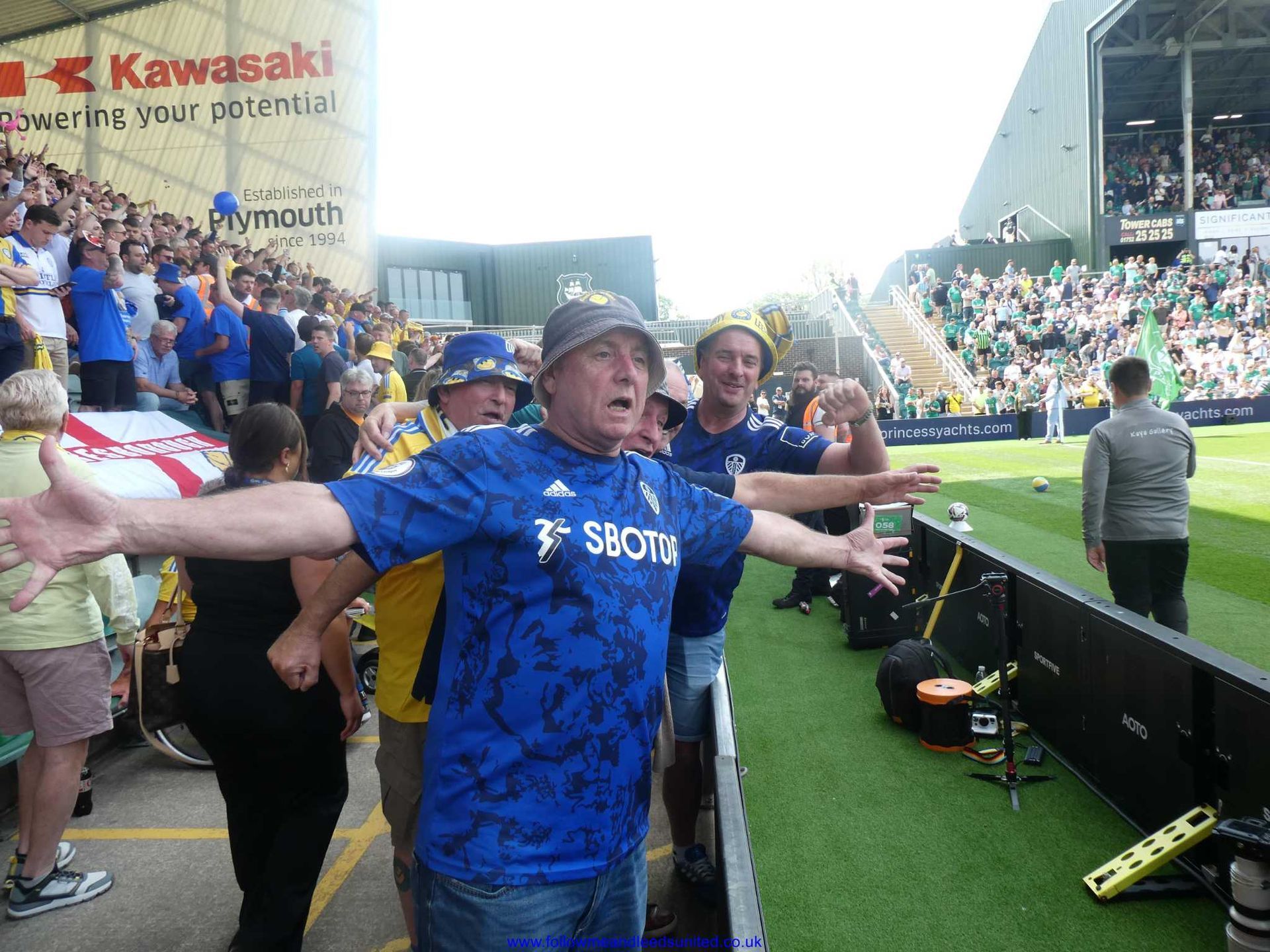 I thought we’d have made some changes at half time but once again, Farke stuck with the same players, and I hoped he’d prove me wrong. Well, it didn’t take long before Solomon sent in a great pass from the byline into the middle of the box and Gnonto ran in to hit a close range shot into the net to equalise. I’m sure Bogle got a touch to the ball before reaching Gnonto. Plymouth had been time wasting and we thought we’d taken the lead when Gnonto picked up the ball to the left of us and hit a shot into the net from a narrow angle, only for it to be disallowed for offside. Replays showed once again that this goal was onside and could have been the difference between going up as champions as Burnley were now winning. That was very frustrating though. As it was, we set up that beautiful finale to send us all delirious with joy. We’d no idea how much injury time there was and then the lad next to me said six minutes were added. Suddenly a Plymouth fan in the left stand started taking the mick out of our celebrations and indicating he wanted to fight the lad next to me. All I was bothered about was the little girl to the left of him who was crying. Plymouth were already relegated which to be honest I thought was a shame as they had amassed 44 points.