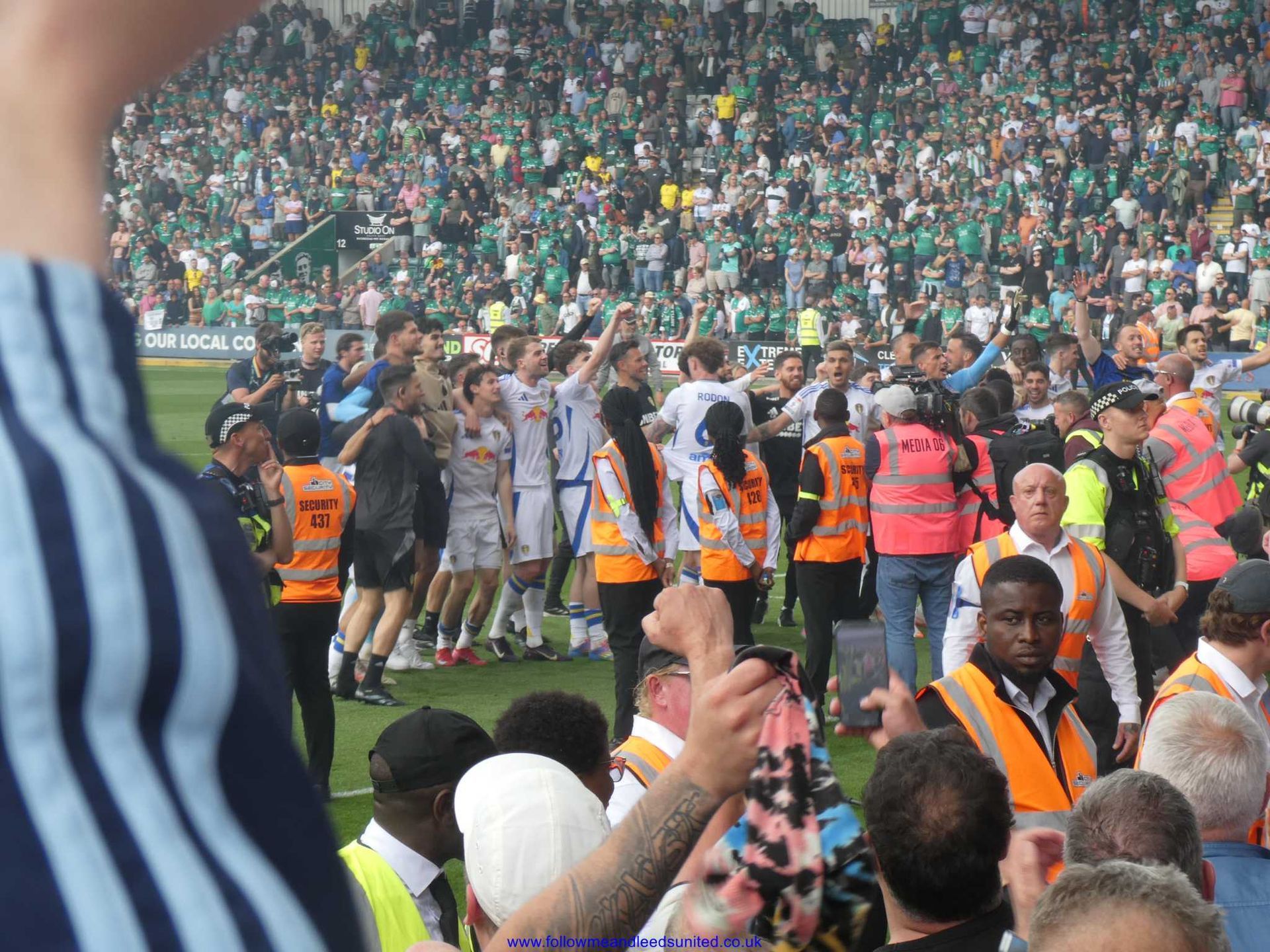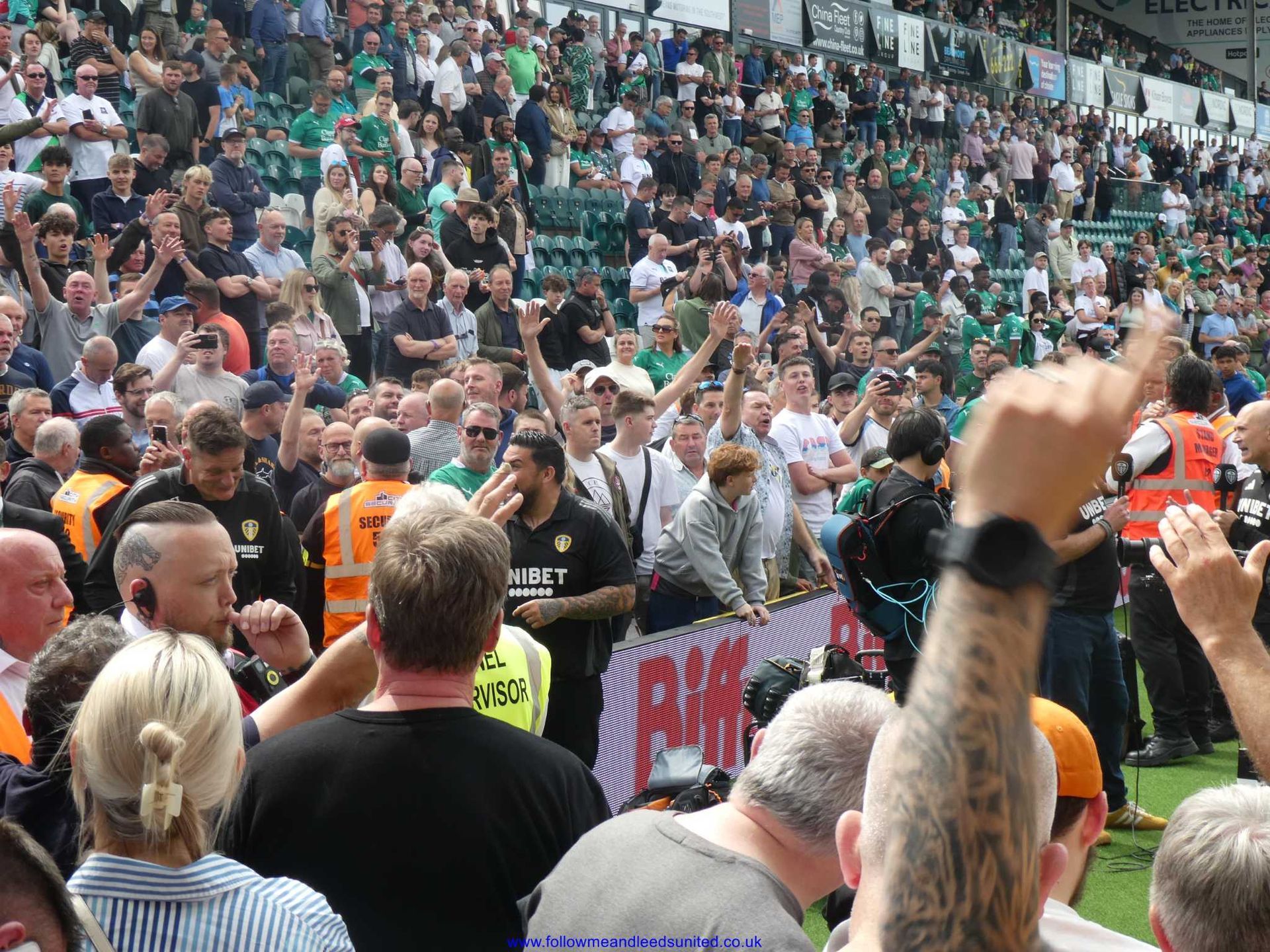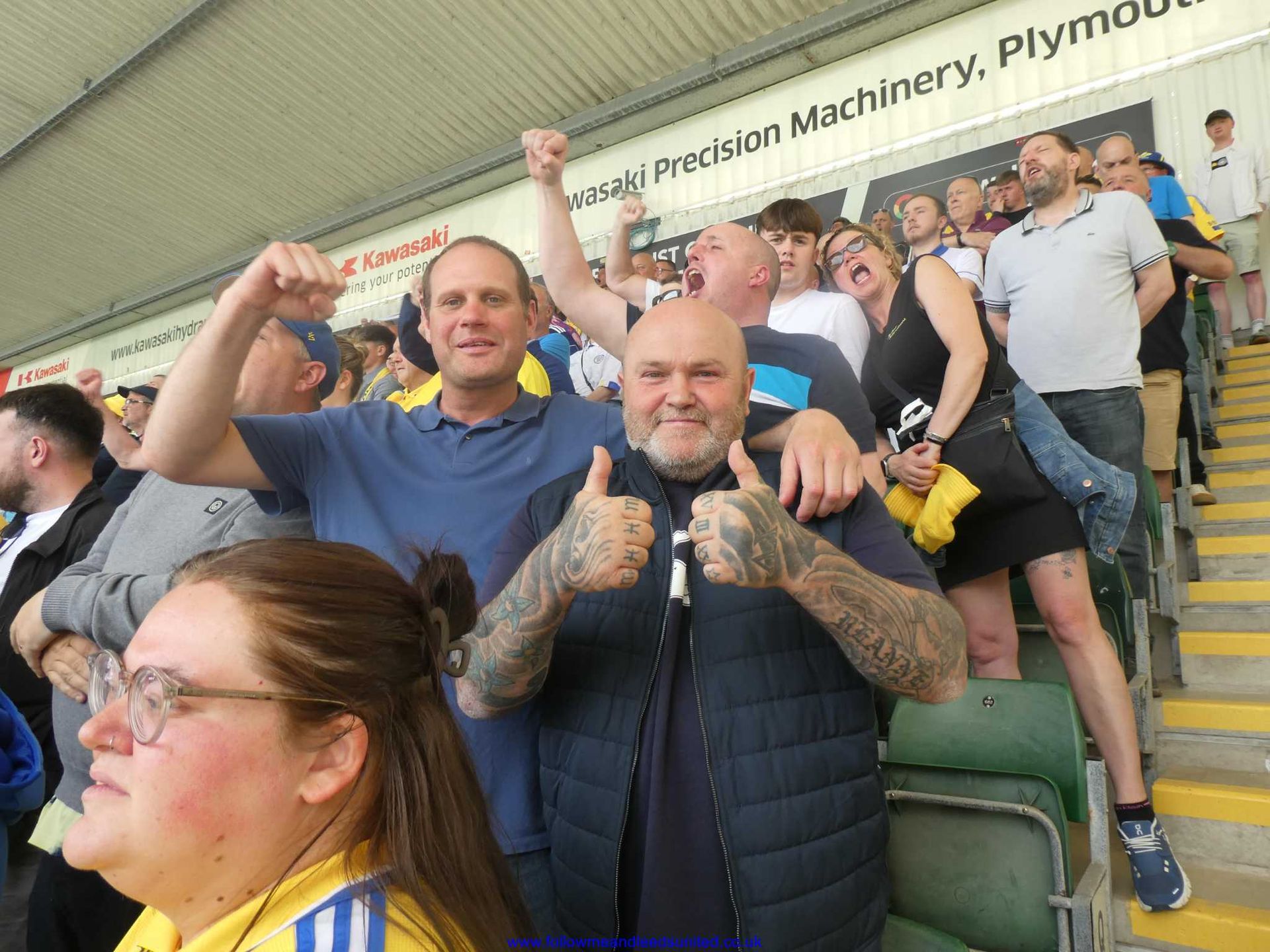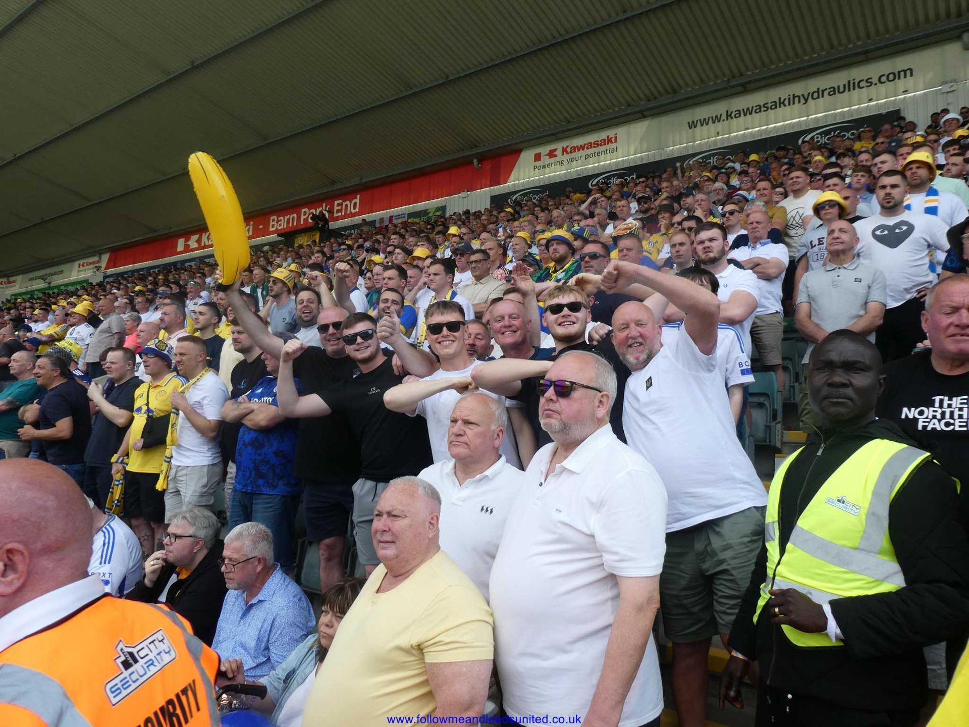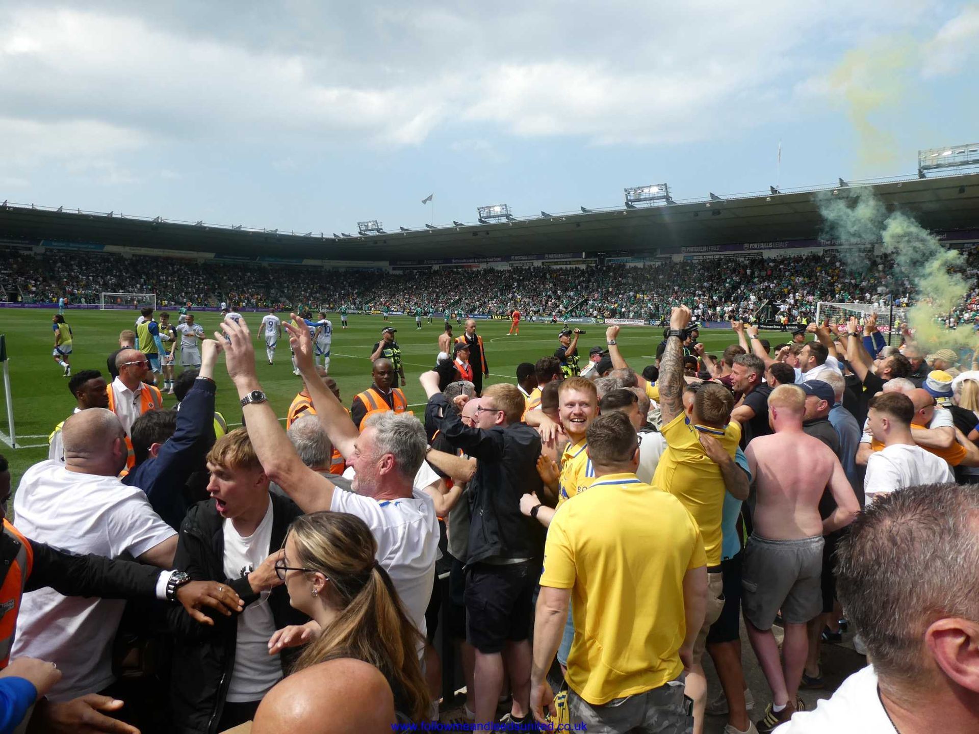 I thought we’d have made some changes at half time but once again, Farke stuck with the same players, and I hoped he’d prove me wrong. Well, it didn’t take long before Solomon sent in a great pass from the byline into the middle of the box and Gnonto ran in to hit a close range shot into the net to equalise. I’m sure Bogle got a touch to the ball before reaching Gnonto. Plymouth had been time wasting and we thought we’d taken the lead when Gnonto picked up the ball to the left of us and hit a shot into the net from a narrow angle, only for it to be disallowed for offside. Replays showed once again that this goal was onside and could have been the difference between going up as champions as Burnley were now winning. That was very frustrating though. As it was, we set up that beautiful finale to send us all delirious with joy. We’d no idea how much injury time there was and then the lad next to me said six minutes were added. Suddenly a Plymouth fan in the left stand started taking the mick out of our celebrations and indicating he wanted to fight the lad next to me. All I was bothered about was the little girl to the left of him who was crying. Plymouth were already relegated which to be honest I thought was a shame as they had amassed 44 points.