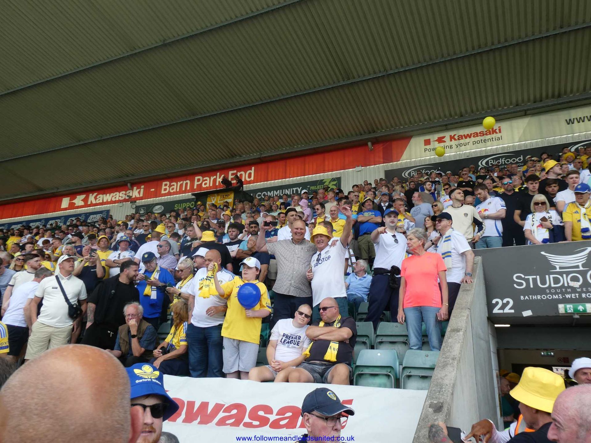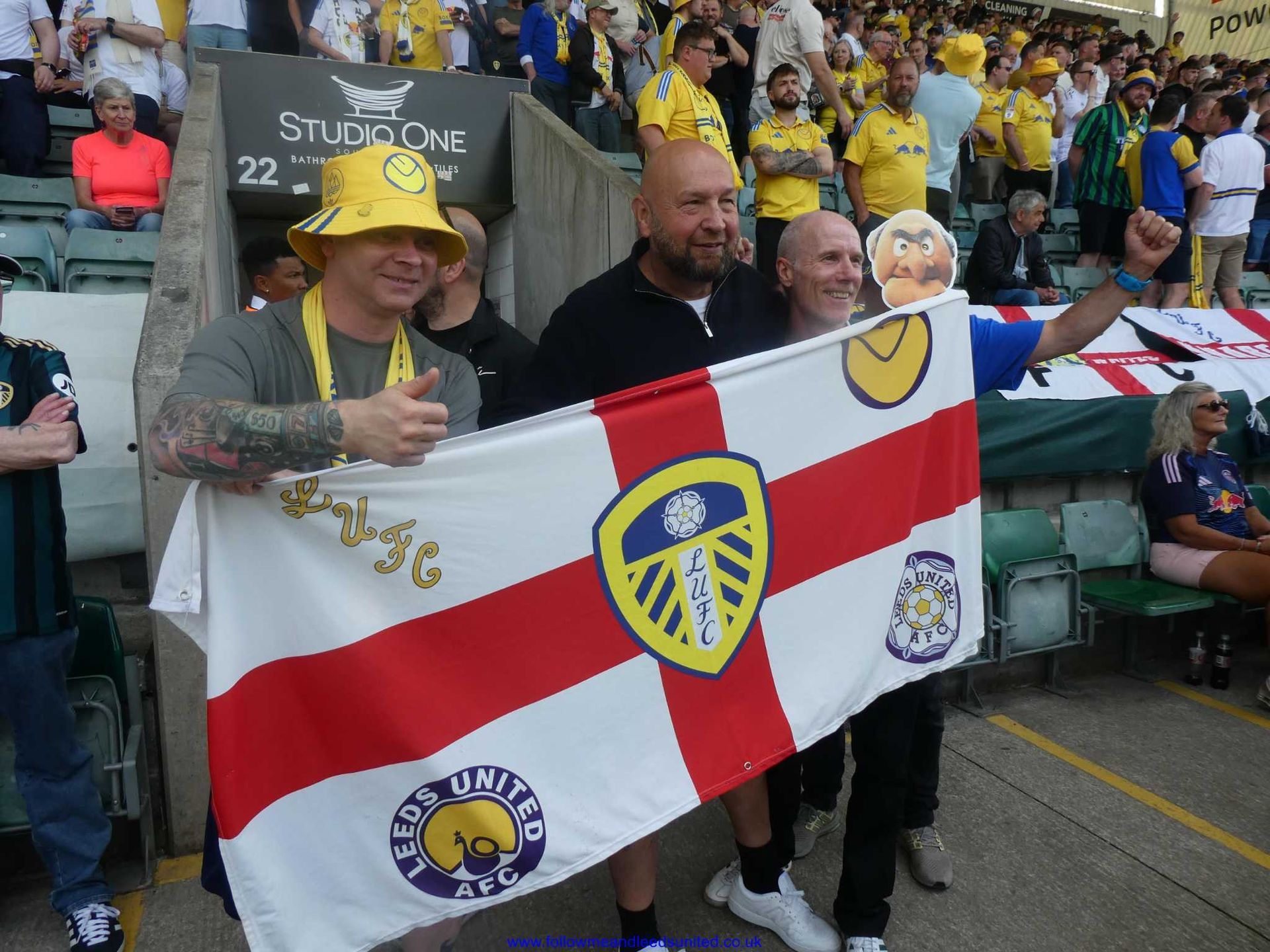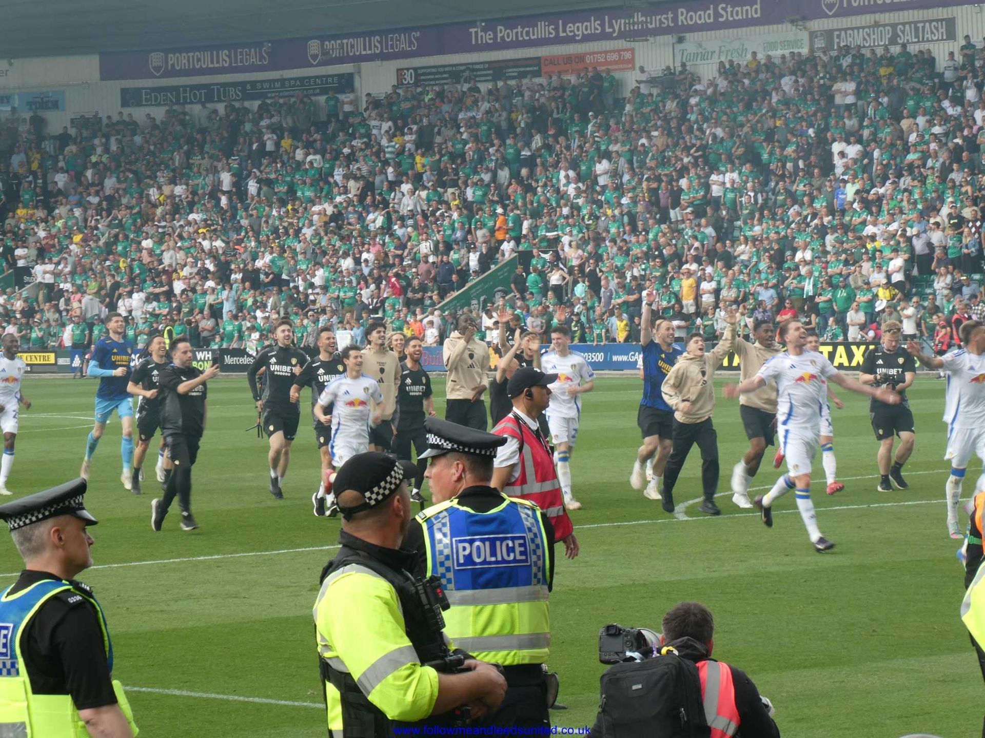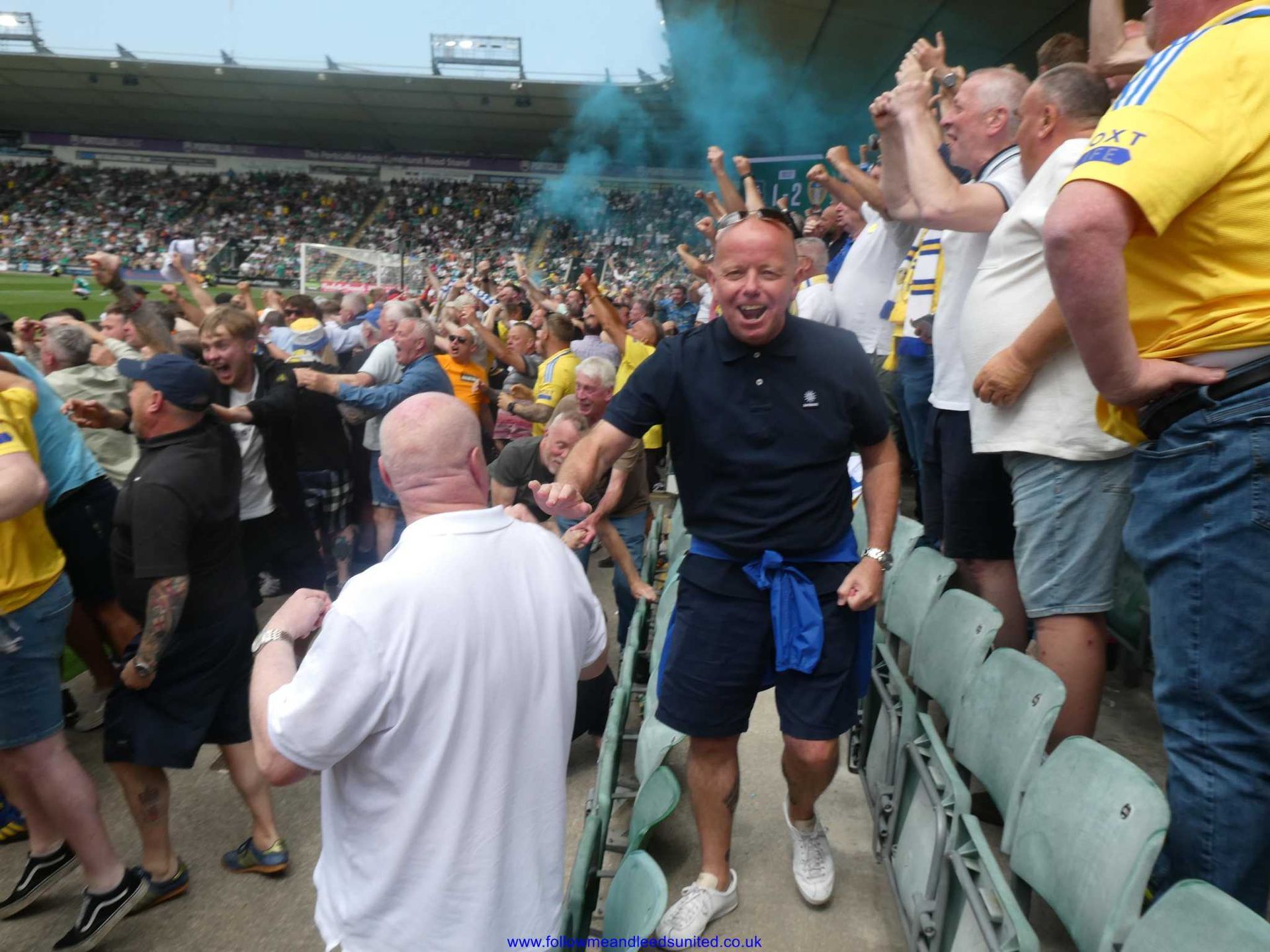 I thought we’d have made some changes at half time but once again, Farke stuck with the same players, and I hoped he’d prove me wrong. Well, it didn’t take long before Solomon sent in a great pass from the byline into the middle of the box and Gnonto ran in to hit a close range shot into the net to equalise. I’m sure Bogle got a touch to the ball before reaching Gnonto. Plymouth had been time wasting and we thought we’d taken the lead when Gnonto picked up the ball to the left of us and hit a shot into the net from a narrow angle, only for it to be disallowed for offside. Replays showed once again that this goal was onside and could have been the difference between going up as champions as Burnley were now winning. That was very frustrating though. As it was, we set up that beautiful finale to send us all delirious with joy. We’d no idea how much injury time there was and then the lad next to me said six minutes were added. Suddenly a Plymouth fan in the left stand started taking the mick out of our celebrations and indicating he wanted to fight the lad next to me. All I was bothered about was the little girl to the left of him who was crying. Plymouth were already relegated which to be honest I thought was a shame as they had amassed 44 points.