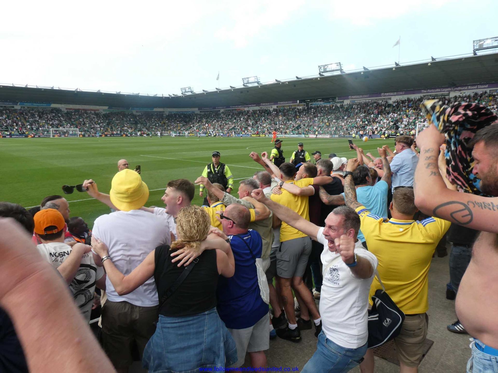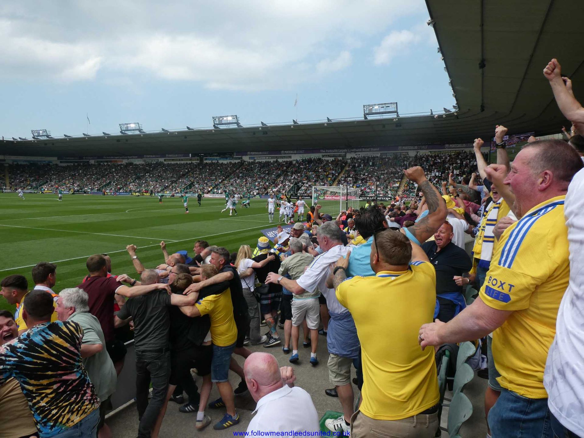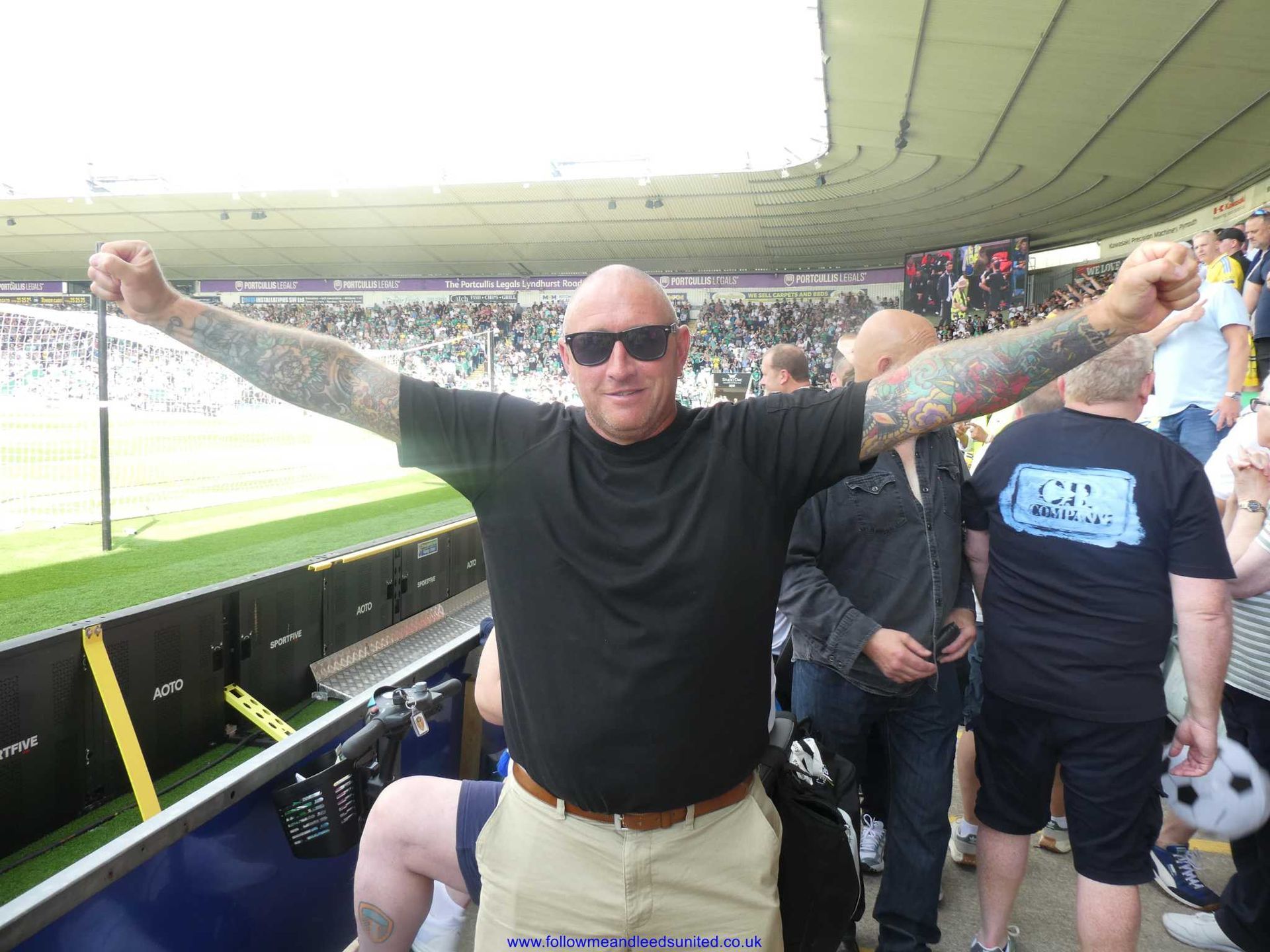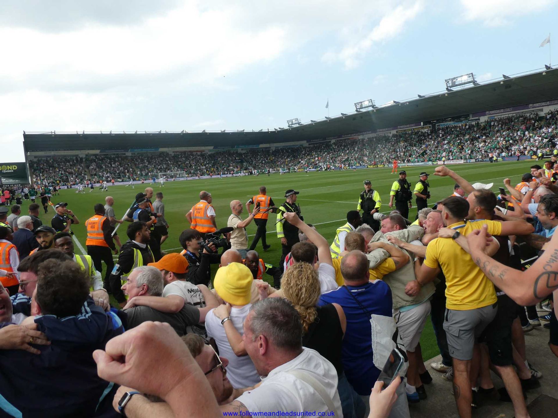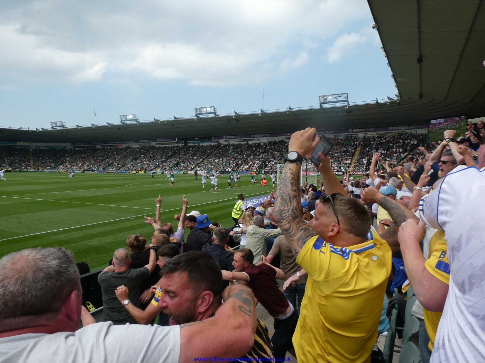 I thought we’d have made some changes at half time but once again, Farke stuck with the same players, and I hoped he’d prove me wrong. Well, it didn’t take long before Solomon sent in a great pass from the byline into the middle of the box and Gnonto ran in to hit a close range shot into the net to equalise. I’m sure Bogle got a touch to the ball before reaching Gnonto. Plymouth had been time wasting and we thought we’d taken the lead when Gnonto picked up the ball to the left of us and hit a shot into the net from a narrow angle, only for it to be disallowed for offside. Replays showed once again that this goal was onside and could have been the difference between going up as champions as Burnley were now winning. That was very frustrating though. As it was, we set up that beautiful finale to send us all delirious with joy. We’d no idea how much injury time there was and then the lad next to me said six minutes were added. Suddenly a Plymouth fan in the left stand started taking the mick out of our celebrations and indicating he wanted to fight the lad next to me. All I was bothered about was the little girl to the left of him who was crying. Plymouth were already relegated which to be honest I thought was a shame as they had amassed 44 points.