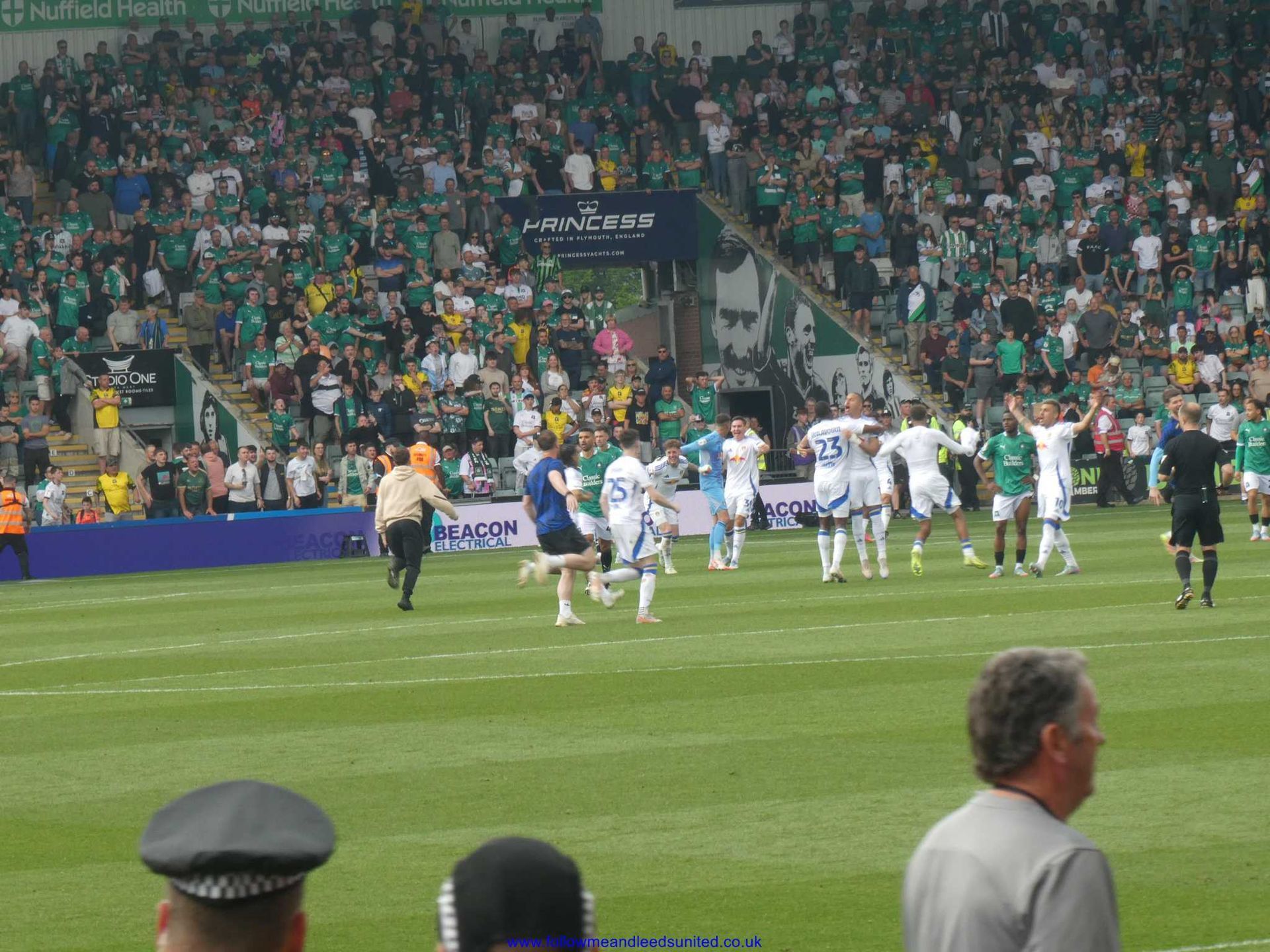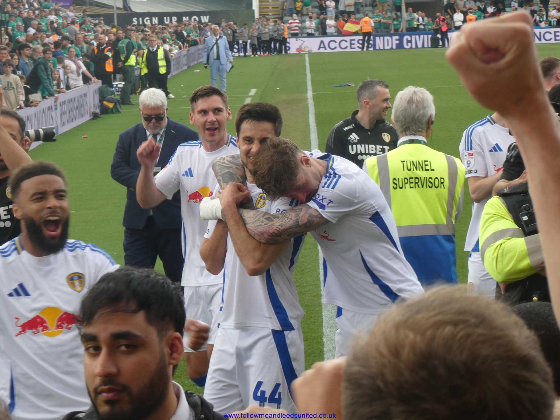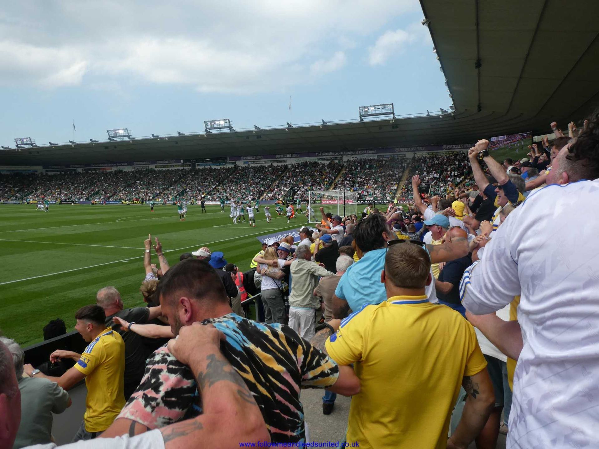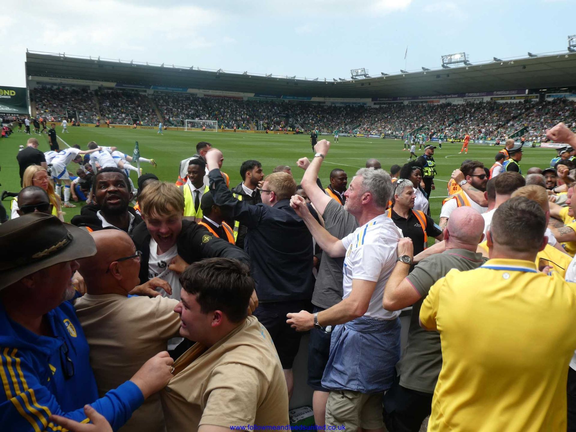 I thought we’d have made some changes at half time but once again, Farke stuck with the same players, and I hoped he’d prove me wrong. Well, it didn’t take long before Solomon sent in a great pass from the byline into the middle of the box and Gnonto ran in to hit a close range shot into the net to equalise. I’m sure Bogle got a touch to the ball before reaching Gnonto. Plymouth had been time wasting and we thought we’d taken the lead when Gnonto picked up the ball to the left of us and hit a shot into the net from a narrow angle, only for it to be disallowed for offside. Replays showed once again that this goal was onside and could have been the difference between going up as champions as Burnley were now winning. That was very frustrating though. As it was, we set up that beautiful finale to send us all delirious with joy. We’d no idea how much injury time there was and then the lad next to me said six minutes were added. Suddenly a Plymouth fan in the left stand started taking the mick out of our celebrations and indicating he wanted to fight the lad next to me. All I was bothered about was the little girl to the left of him who was crying. Plymouth were already relegated which to be honest I thought was a shame as they had amassed 44 points.