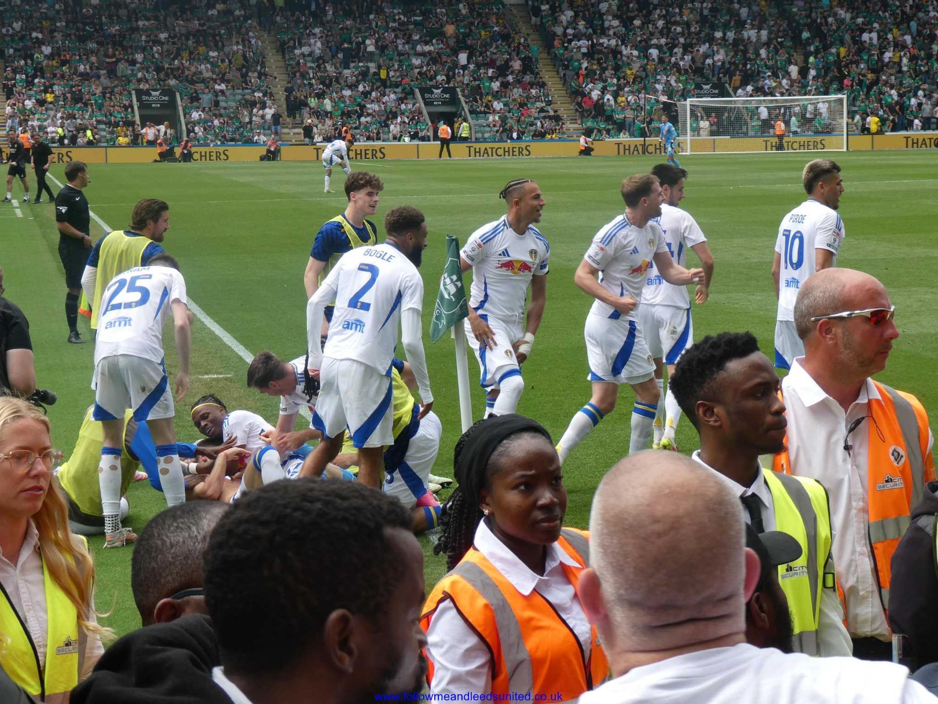 Leeds got into good positions but were very wasteful with chances with none on target. Plymouth had an attack, and their player looked to have the ball stuck to his boot as rode his luck through our players. He unleashed a shot that cannoned back off the upright giving us a narrow escape. Sadly, we didn’t learn from that as our attack broke down and they counterattacked. Their player once again beat our players and crossed the ball from the byline which bounced back off the post and hit poor Byram scoring an own goal. We still got into some good positions and Byram sent a great cross in only for everyone to miss it. How it missed Bogle I’ll never know. Aaronson had a shot saved by the keeper, but it felt a bit of a dé ja vue situation and that we weren’t fighting to become champions on the day. I said that I’d been up since 1.20am and travelling through the night to the game, not them. Whilst queuing up at half time, we were all discussing how the team were putting us through the despair of things not going our way. One girl was really positive saying that we would come out in the second half with all guns blazing. We were all happy with her prediction.