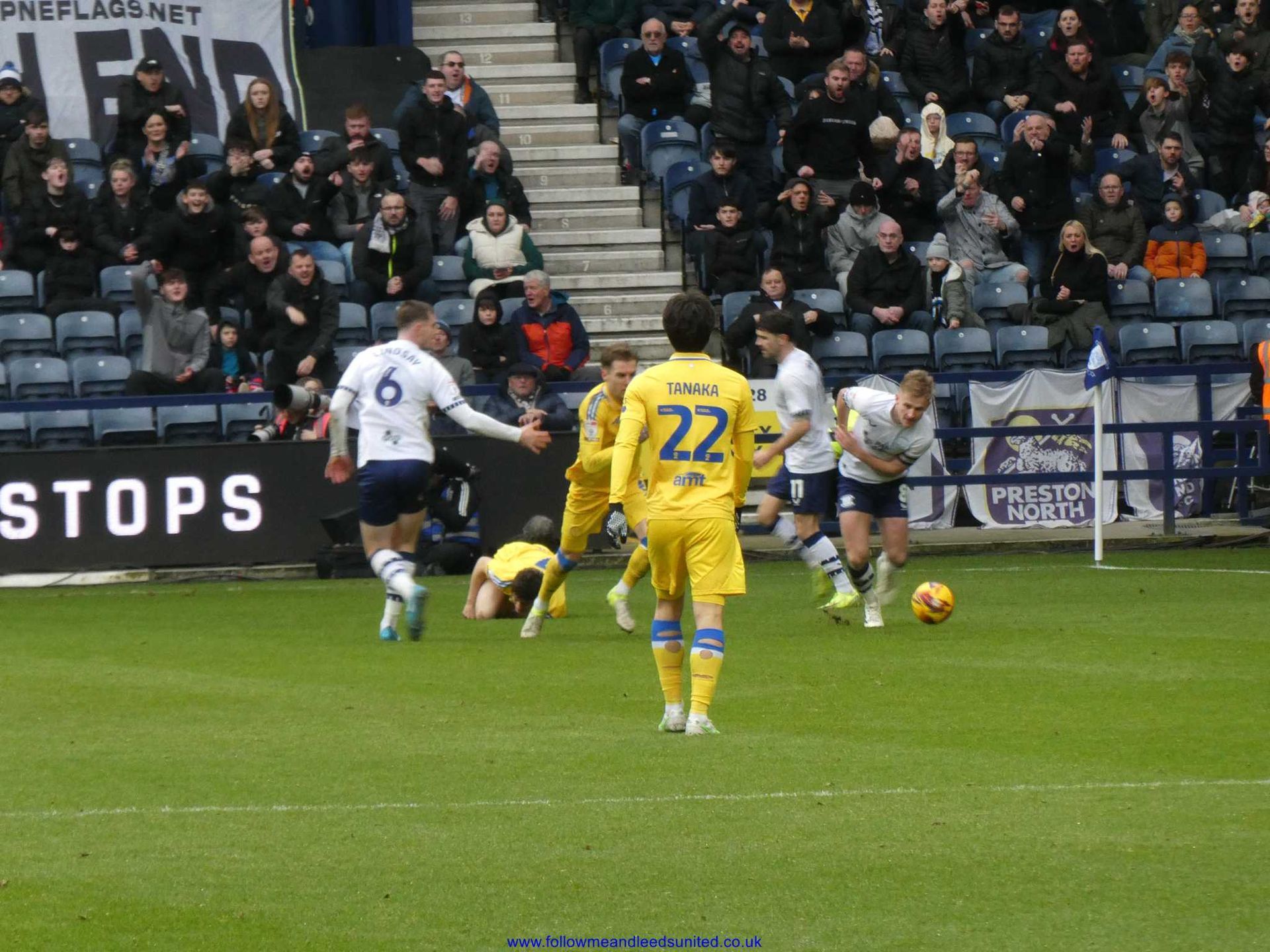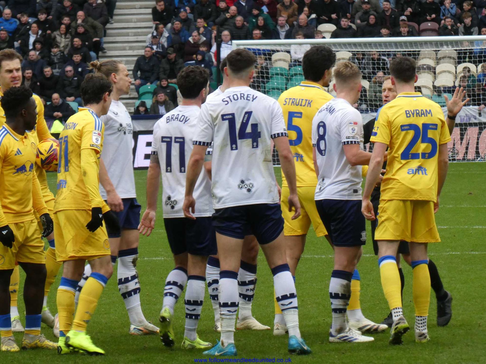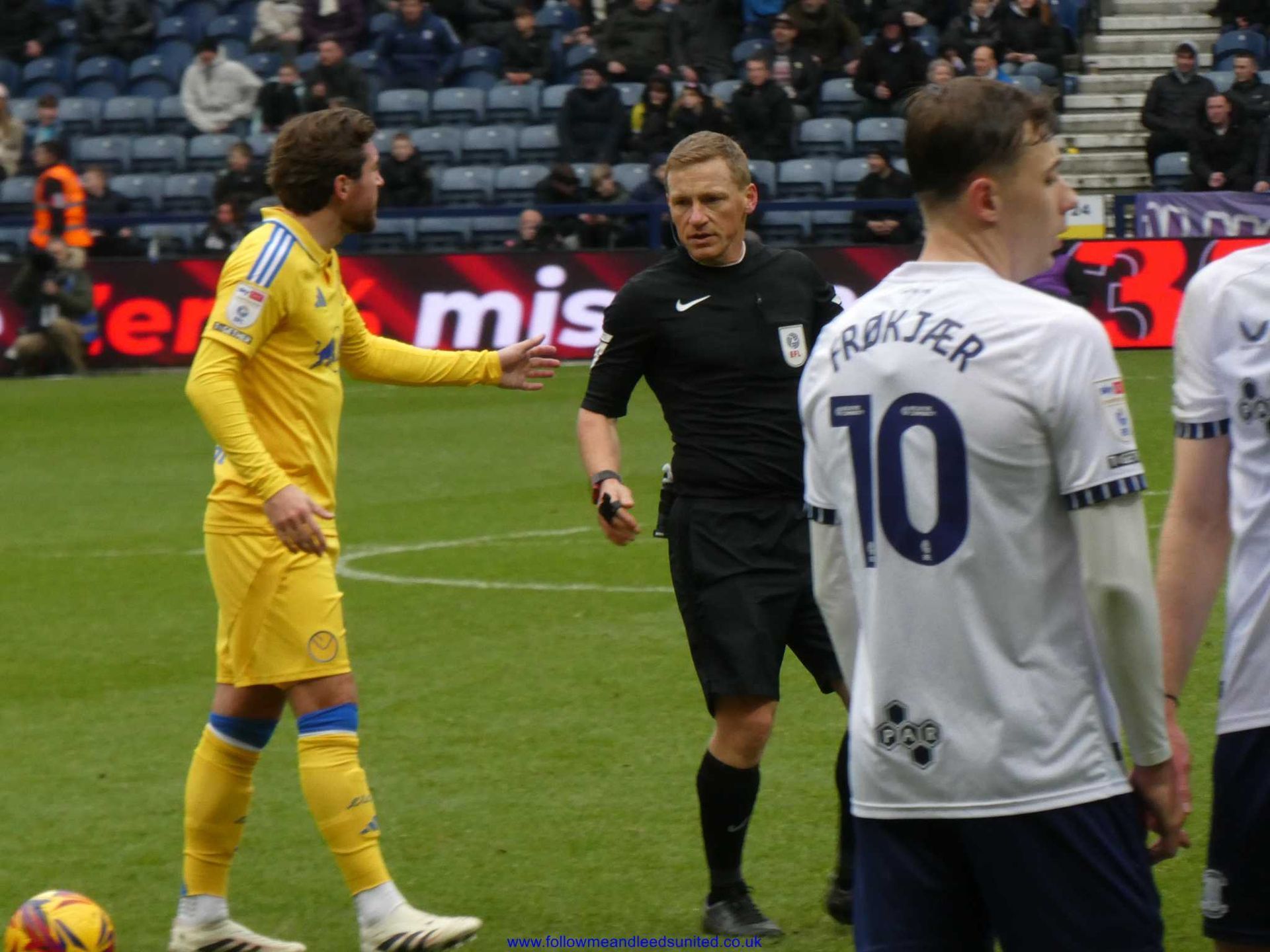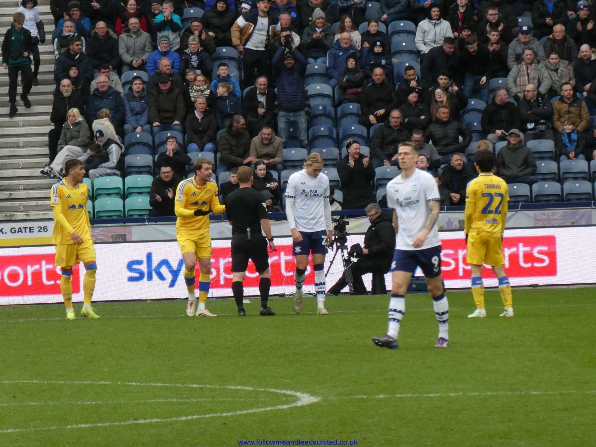 The first twenty minutes of the game were very scrappy and underwhelming because although we had a lot of possession, we didn’t really do much with it. After another attack towards over 5,000 Leeds fans broke down, we were made to pay the price for our defence being so far forward as Preston raced to the other end to take the lead. It wasn’t a surprise though as we could see it coming as they’d already had a counterattack. The game started being littered with plenty of fouls, but the bad ones were committed by Preston, and they were lucky that their man stayed on the field after a foul on Bogle. Even if it wasn’t a straight red, he had already been booked so should have been sent off. Sadly, it was Farke who ended up with a yellow card. Preston obviously knew he should have been sent off and that he was lucky to stay on the pitch as he was subbed at half time. The referee lost it in my opinion with some of the decisions he made before half time too. Games at Preston in recent years have always been quite feisty from them for some reason. Leeds did get in a good position to score only to see Aaronson’s shot go way over the goal.