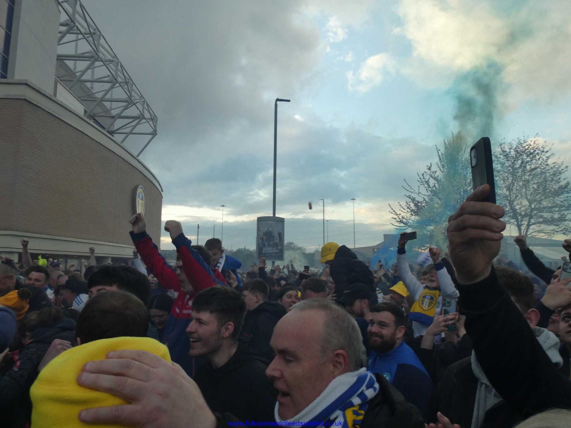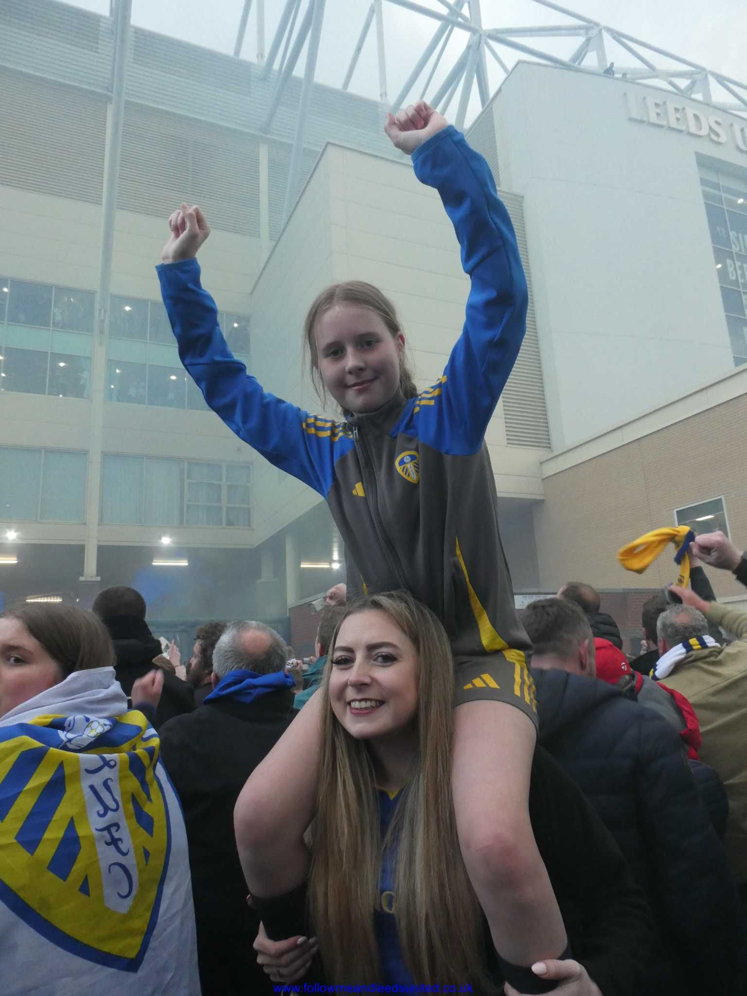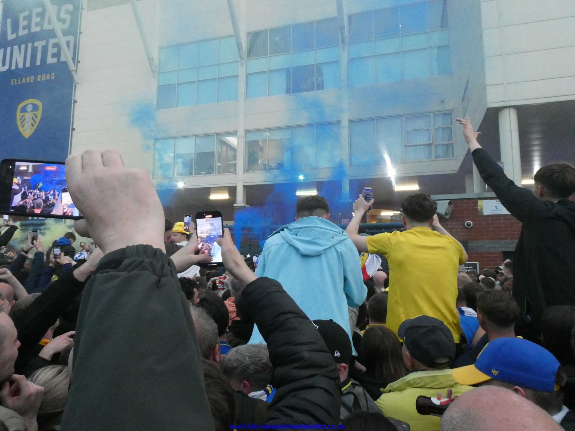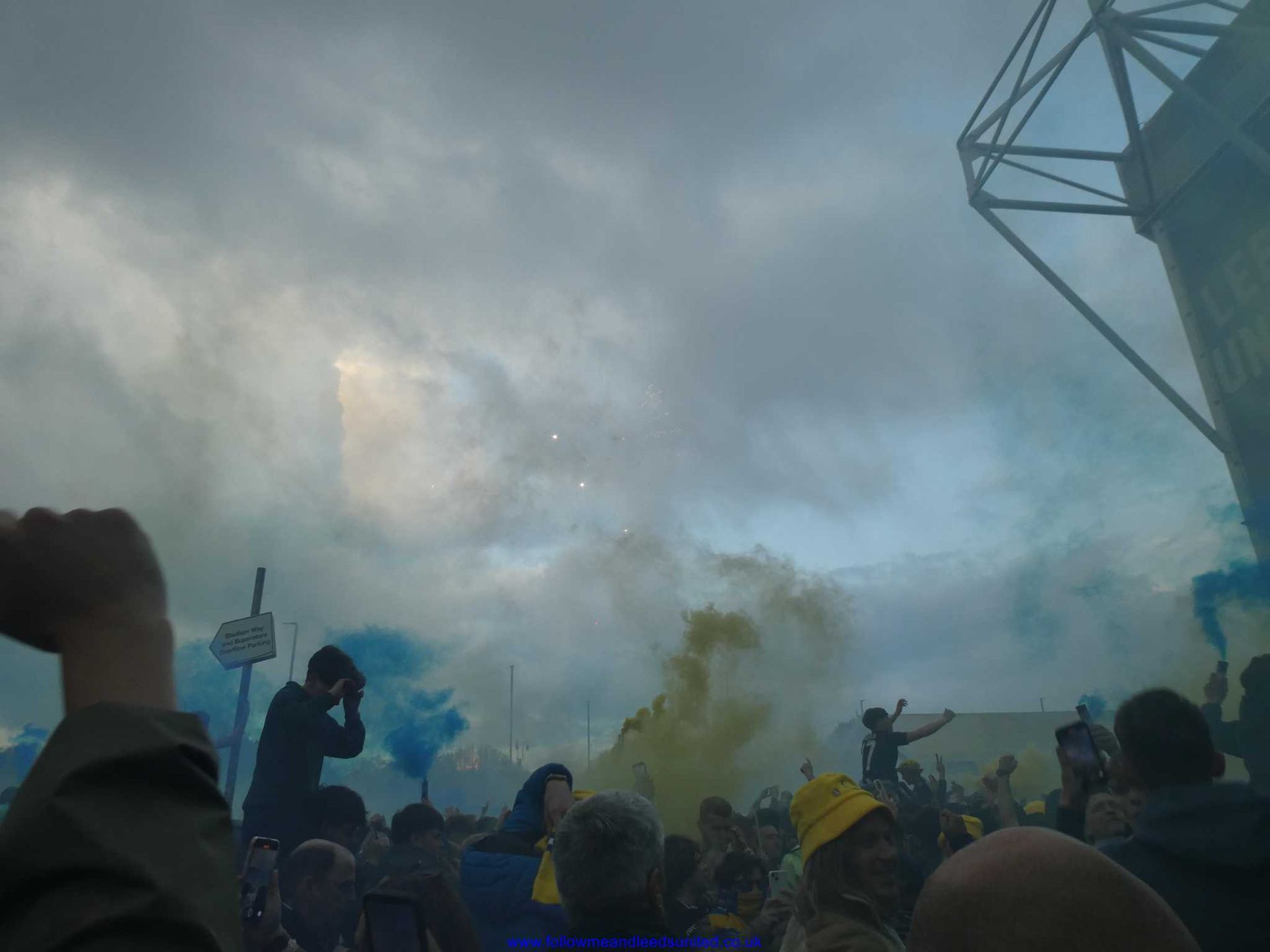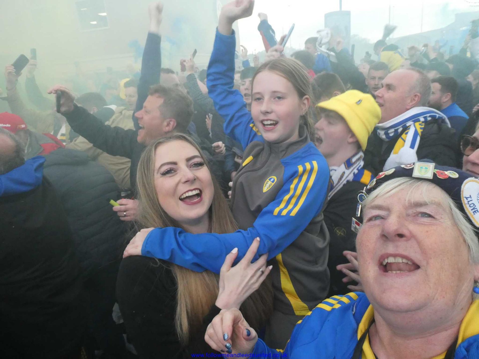 At the end of the game, we went back to the Holbeck Working Men’s Club before heading back down to Elland Road to celebrate our promotion as Burnley were winning Sheffield United. Great scenes as we celebrated with the team and other fans although the flares let off stunk to high heaven. A nice gesture was my granddaughter being given a Leeds scarf to cover her face when the smoke was overpowering. The smoke lingered in my throat long into the night too. It was also very humbling to be told that I am an inspiration which were amongst some of the lovely words said to me by our fans today. With the hugs and thoughts about my late husband, I couldn’t ask for more support from so many of you which is why Leeds United supporters are second to none.