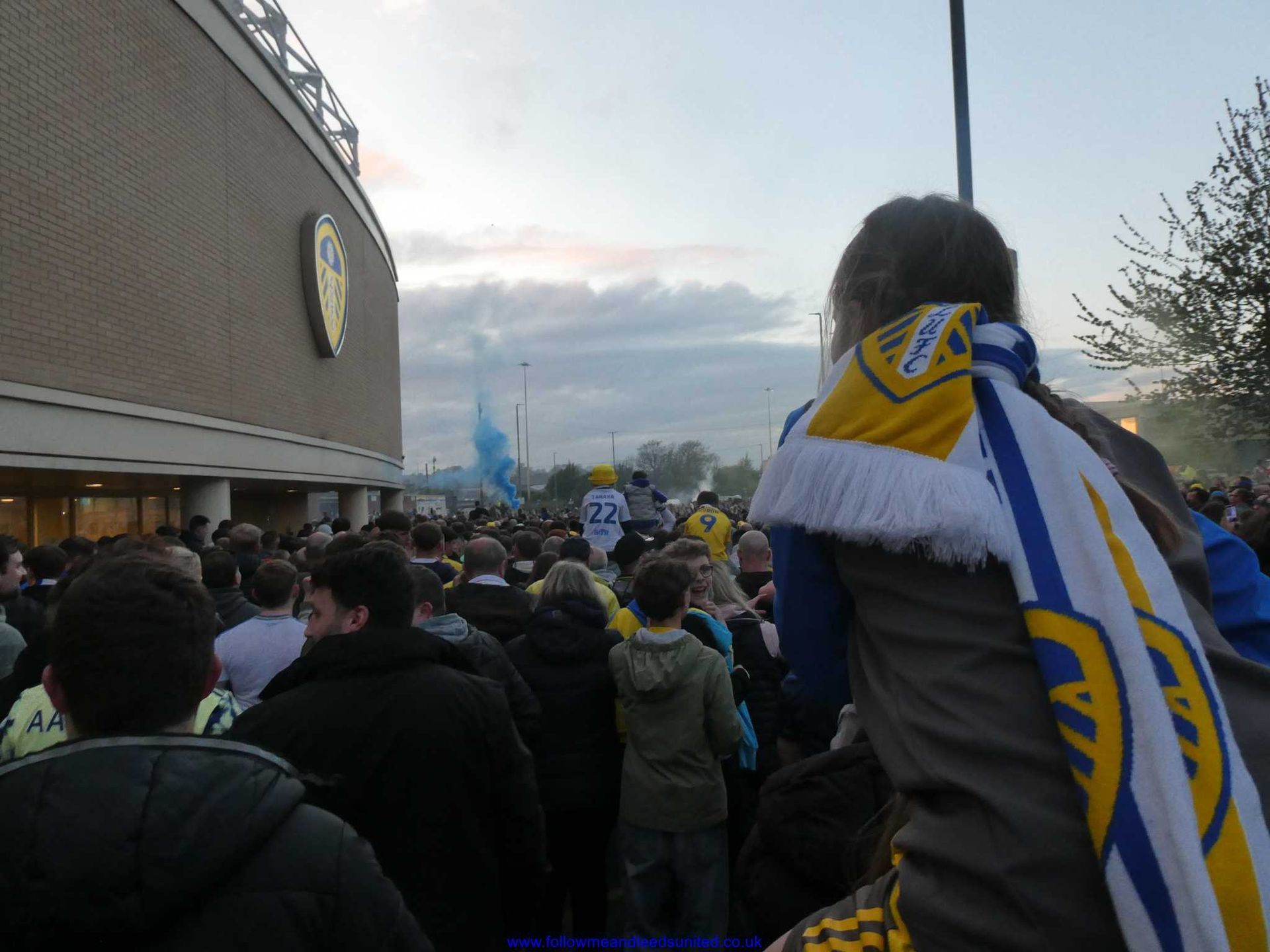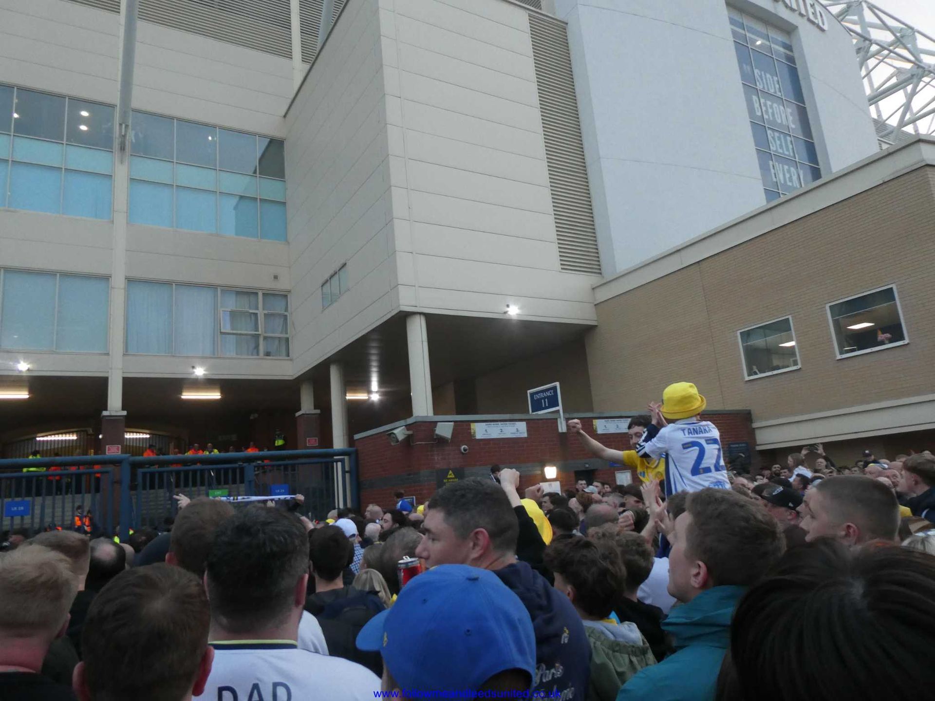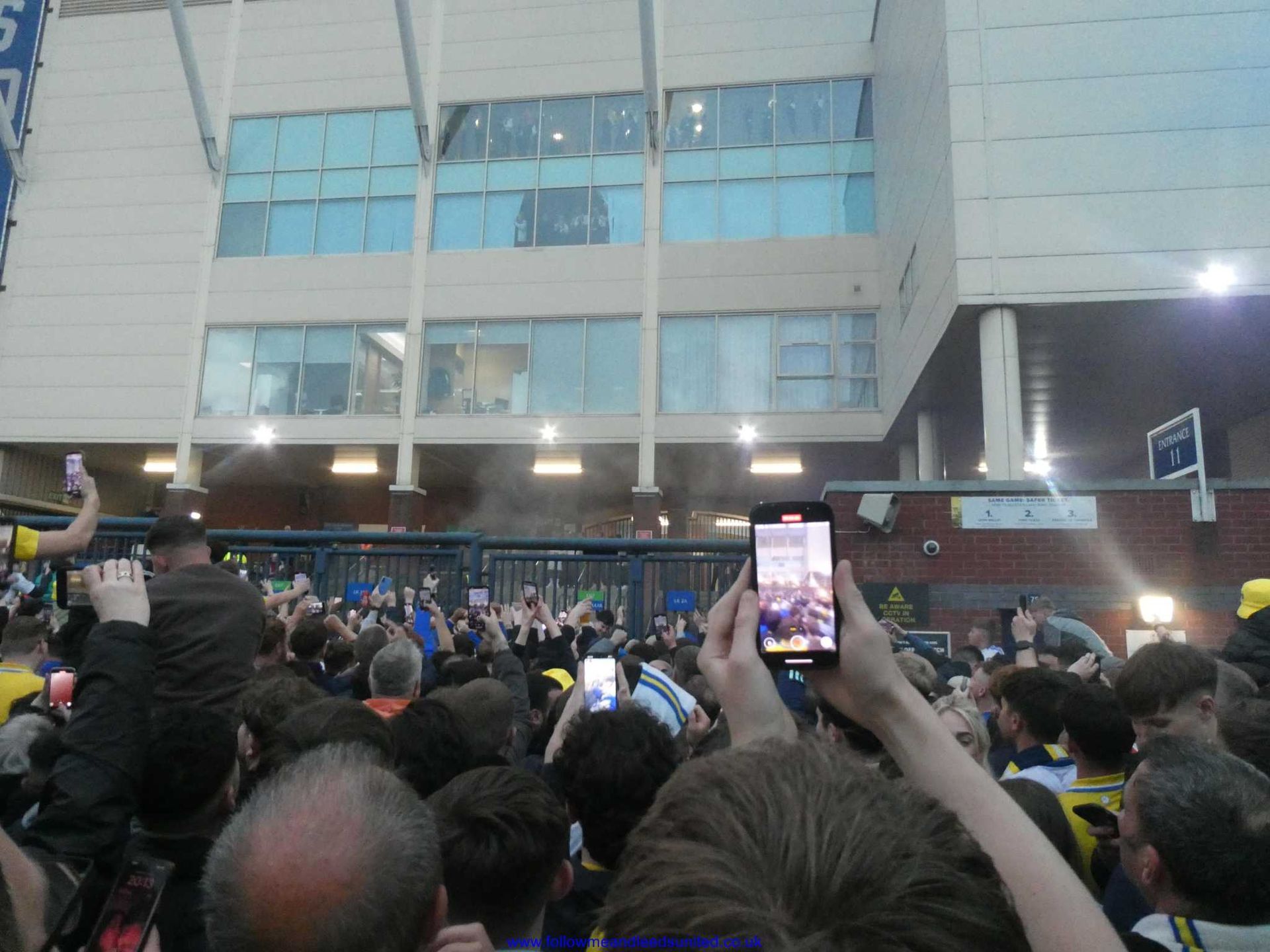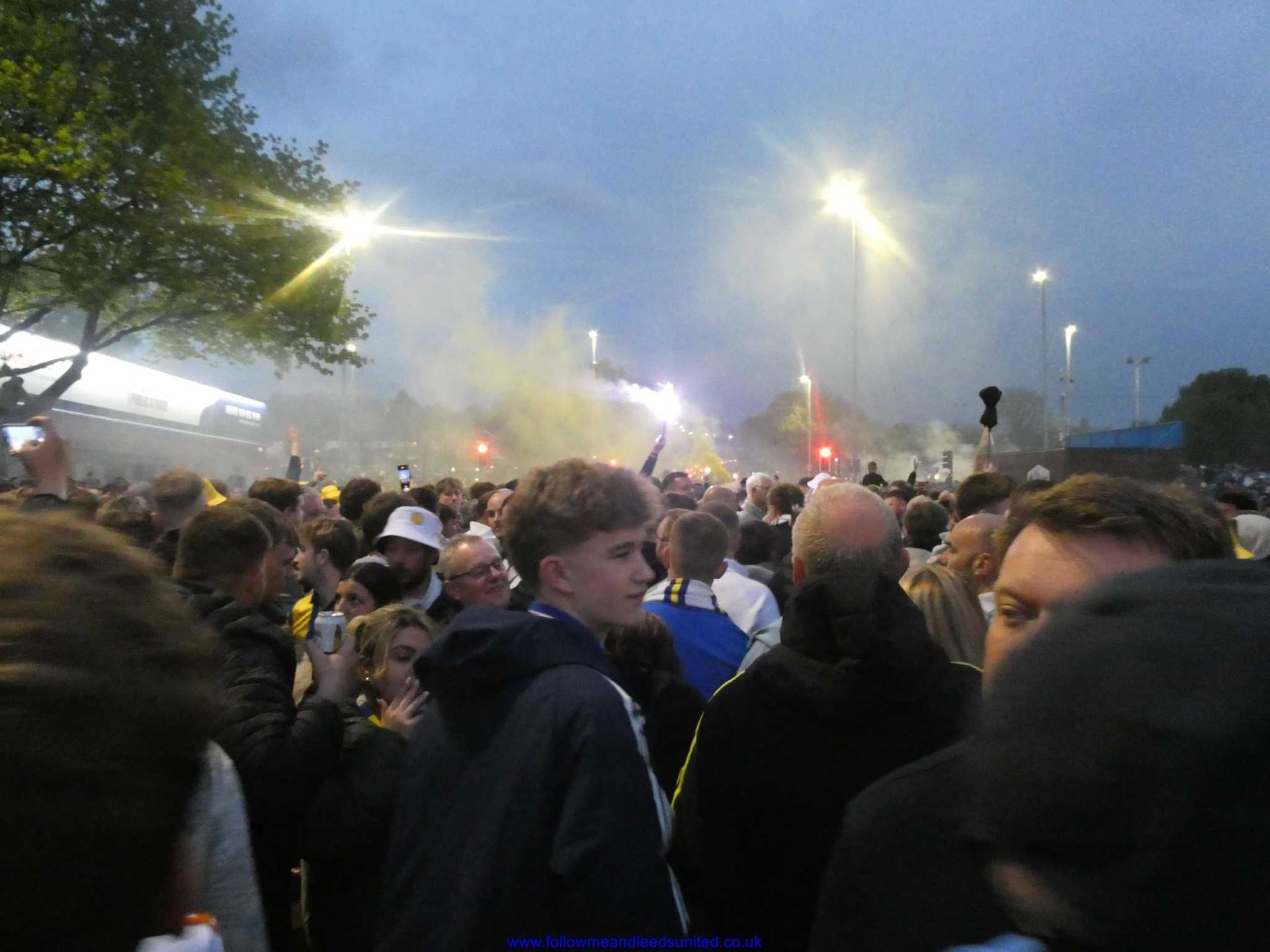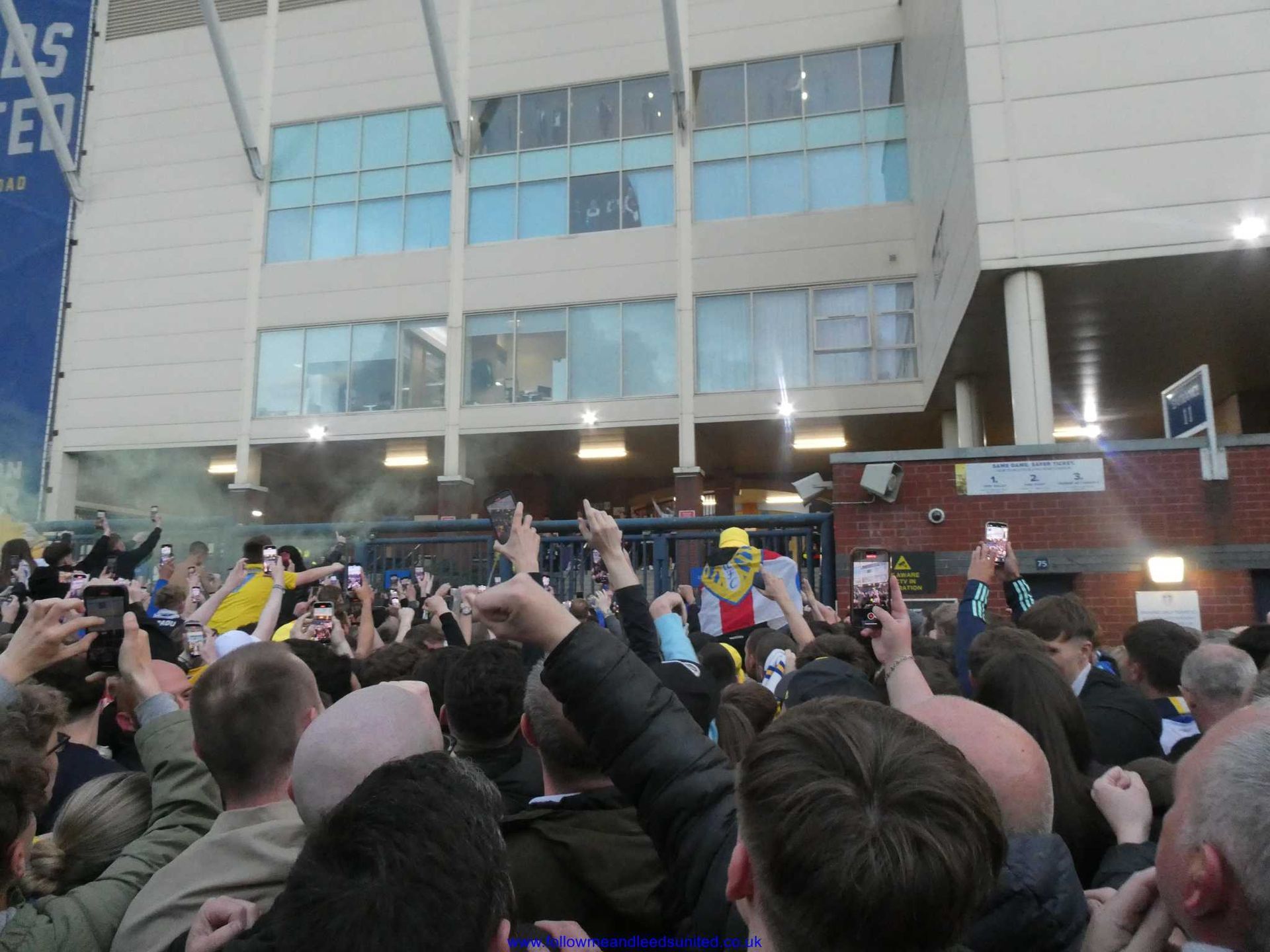 At the end of the game, we went back to the Holbeck Working Men’s Club before heading back down to Elland Road to celebrate our promotion as Burnley were winning Sheffield United. Great scenes as we celebrated with the team and other fans although the flares let off stunk to high heaven. A nice gesture was my granddaughter being given a Leeds scarf to cover her face when the smoke was overpowering. The smoke lingered in my throat long into the night too. It was also very humbling to be told that I am an inspiration which were amongst some of the lovely words said to me by our fans today. With the hugs and thoughts about my late husband, I couldn’t ask for more support from so many of you which is why Leeds United supporters are second to none.