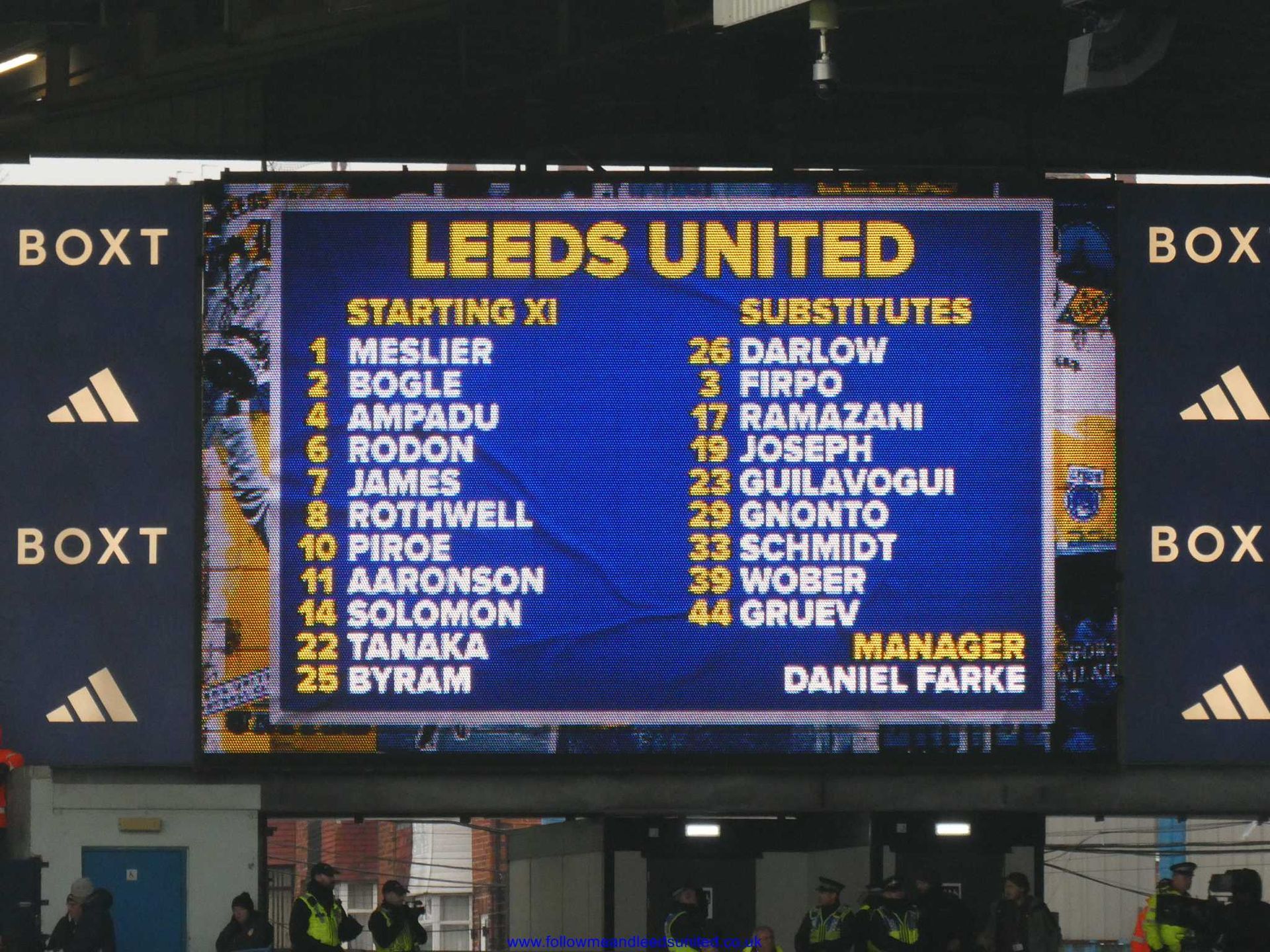 Team: Meslier, Ampadu, Rodon, James, Bogle, Byram, Rothwell, Solomon, Piroe, Aaronson, Tanaka.