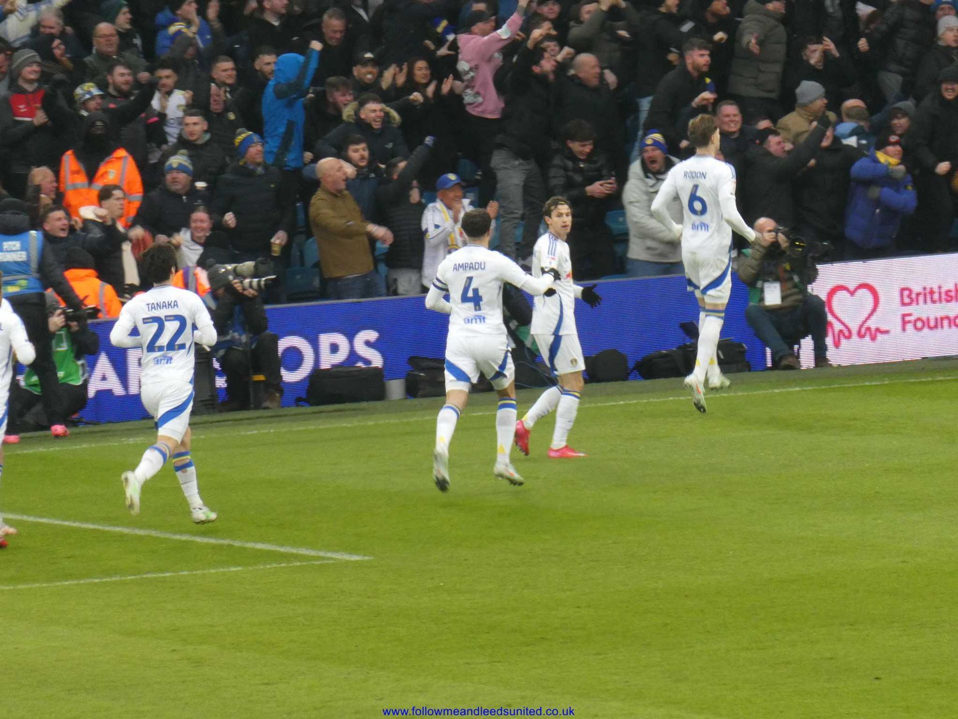 The second half saw their keeper make another save from James, but all the time Wednesday looked dangerous, and my nerves started to kick in. Their speed put us on the backfoot but thankfully Meslier pushed the ball wide for a corner. We needed a second goal that’s for sure. As we were getting ready to make two subs, one of the Wednesday players was down getting treatment. My first thoughts were, are we going to bring them on now or wait? As it was, we brought them on, and Joseph was immediately into the action being brought down. From the resulting free kick, Gruev saw his shot go narrowly over the top. Despite the referee putting a line across where the Wednesday players had to stand, they still stood in front of it even when this was pointed out to the referee. When we made our next two subs replacing both wingers in James and Solomon, my stomach churning got worse as I didn’t want things to backfire for us. I needn’t have worried because our second goal came very quickly when Ramazani picked up the ball at the edge of the box. He looked to have missed an opportunity to shoot before turning and sending a lovely ball into the corner of the net. I caught part of his somersault celebrating his goal, but phew, that was just the break we needed. With seven minutes of injury time, I was still very nervous, but it was us who got the third goal to put the game beyond Wednesday when Tanaka backheeled the ball into the opposite corner away from their keeper.