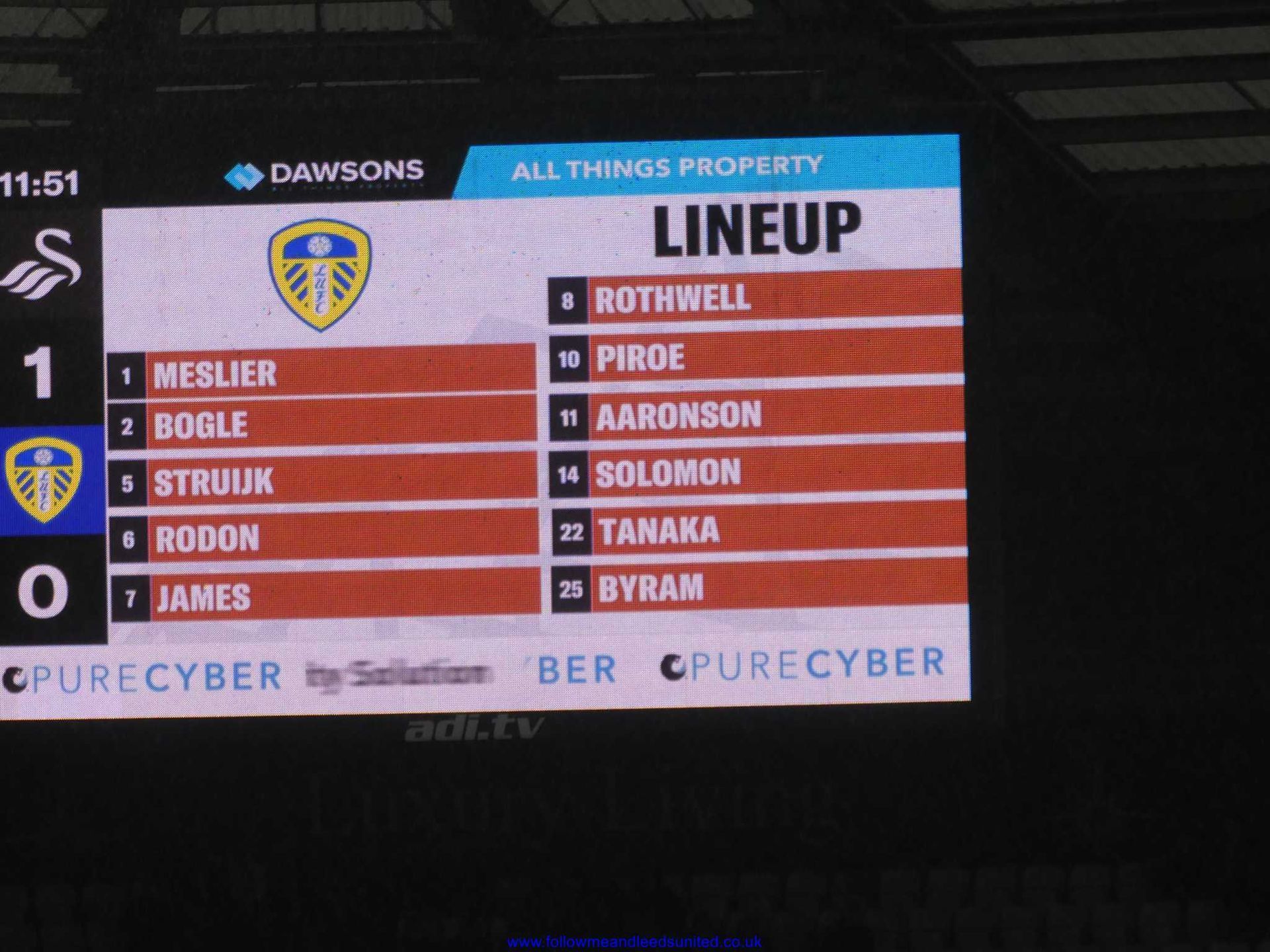 Team: Meslier, Struijk, Rodon, Bogle, James, Byram, Soloman, Rothwell, Aaronson, Tanaka, Piroe
