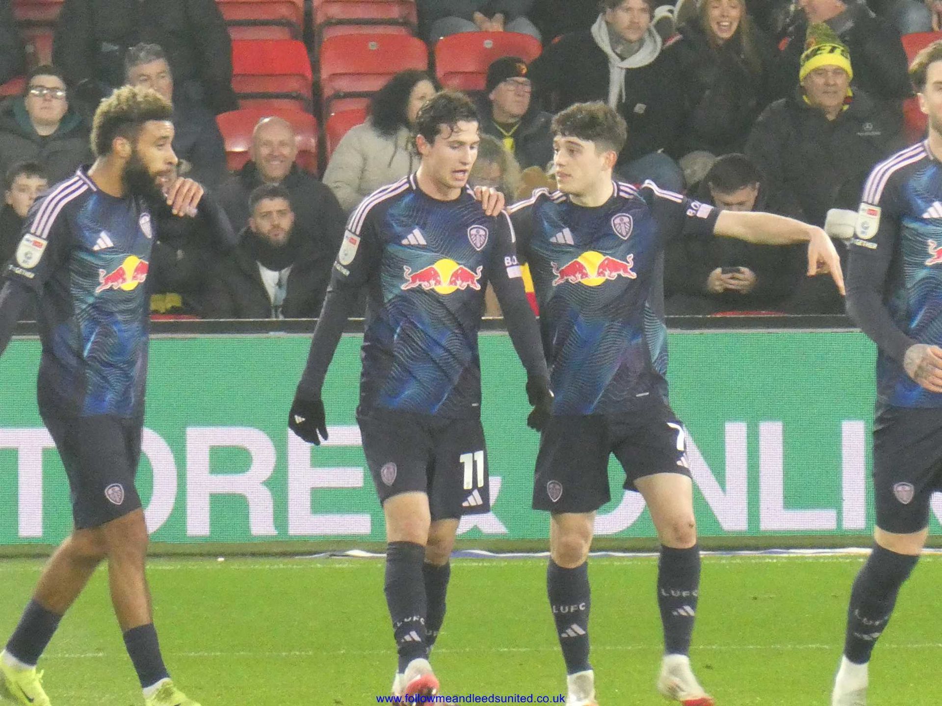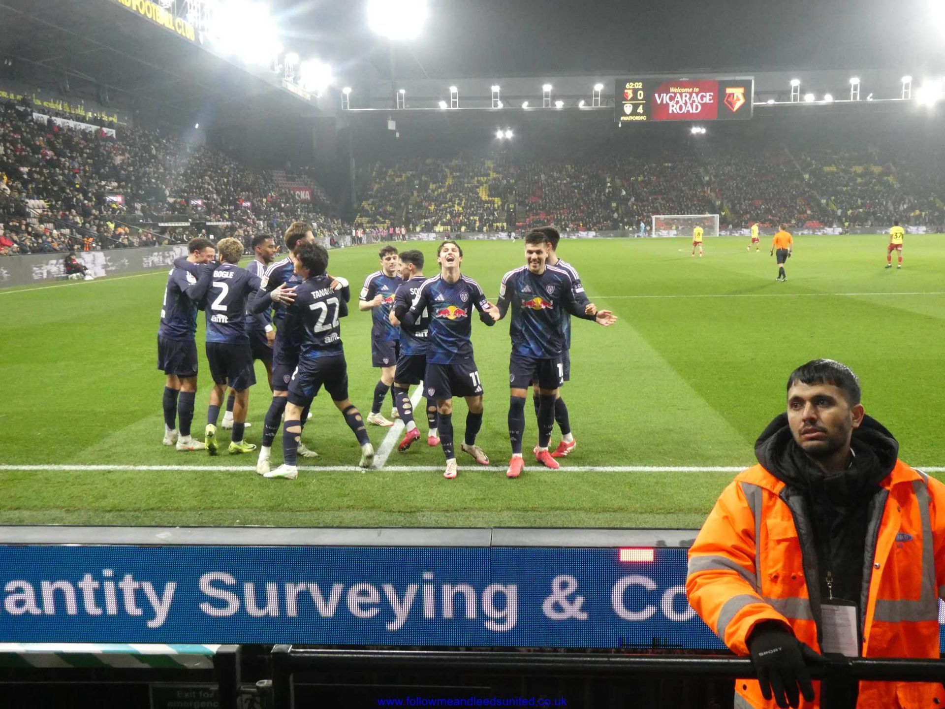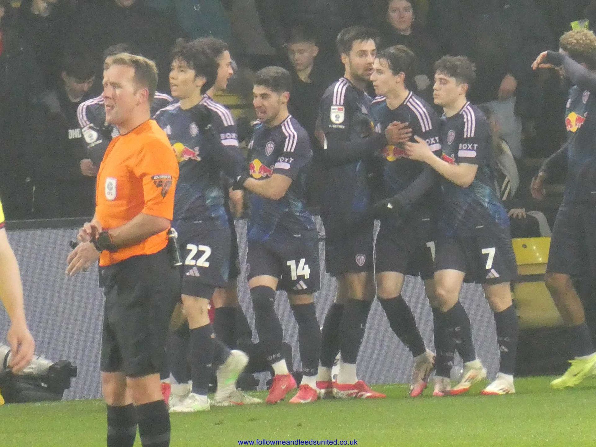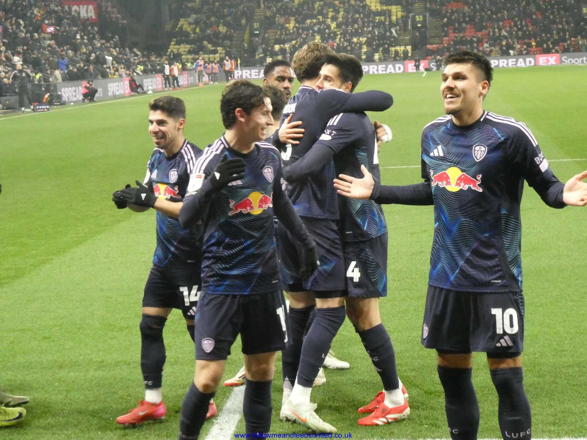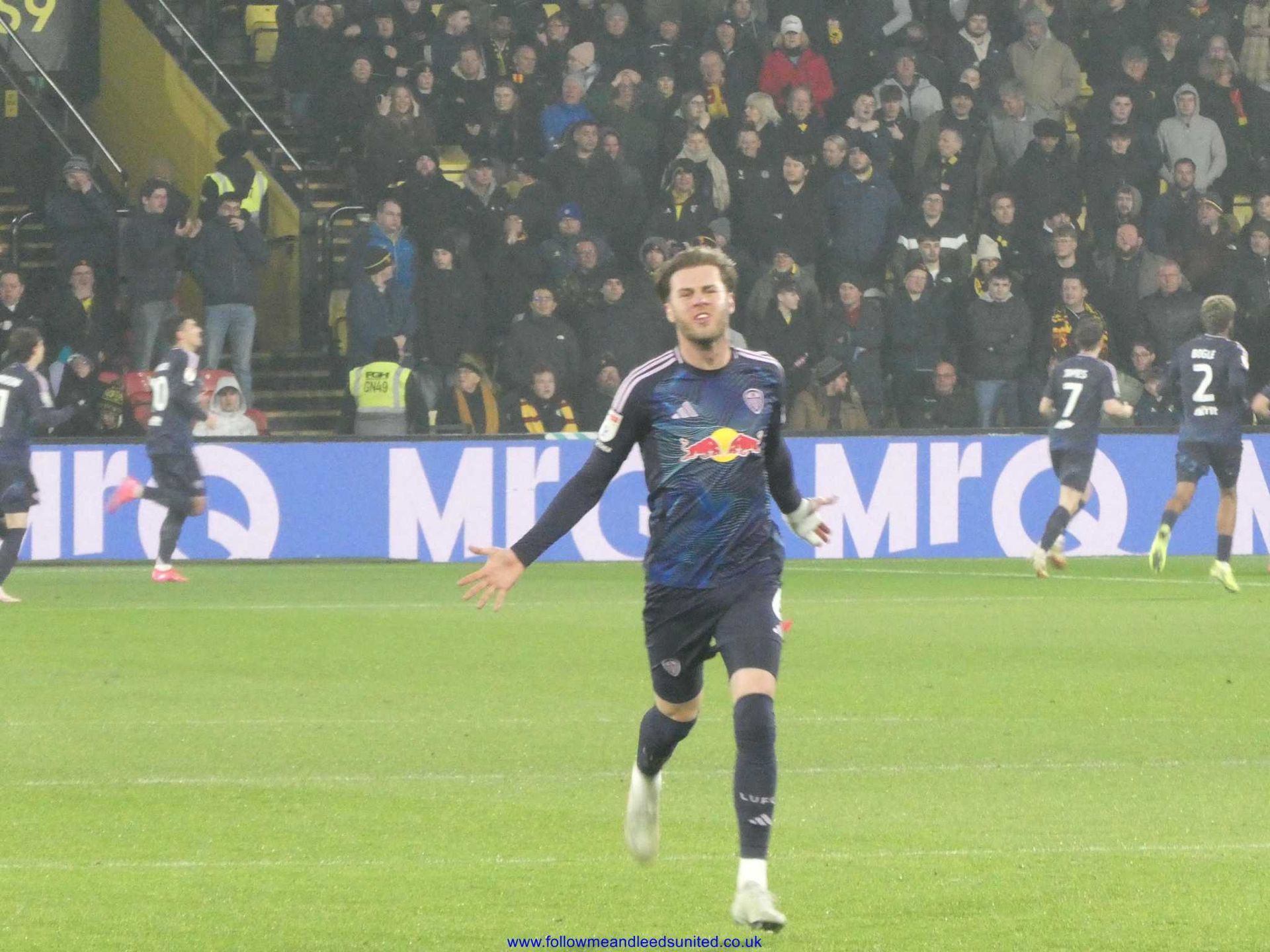 Both teams came out of the starting blocks quickly with Watford winning a corner and Leeds having a shot which deflected wide. There was plenty of attacking with end-to-end football and Leeds came the closest to taking the lead after a fast move involving Solomon and Aaronson which saw a Piroe shot saved by the keeper. Shortly afterwards we took the lead after James picked up a bad back pass and ran forward, composed himself and smashed the ball into the net. James increased our lead eight minutes later after a great counterattack. Aaronson sent a great pass to Piroe on the wing whose precision pass to James in the middle saw his speed once again cause issues for their defence and smashed a second goal into the net to put us two up. Well, I never saw that coming!! Meslier then made an important save when the Watford player got through our defence with only him to beat. We took an even bigger lead when Solomon kept hold of the ball under pressure from a Watford player and shot from outside the area, only to see the ball deflected into the net for a third with their keeper rooted to the spot. Wow but I’ll take that, we hadn’t even got to half time and were three goals to the good already. James was so unlucky not to get a hattrick as Leeds came out from defence once again. He was well behind as the defender chested the ball down, but James’s speed took him past, and he hit a first time, long range shot with their keeper grasping fresh air, but the ball went wide. What a shame as he is my favourite player, is so lovely and it would have been so deserved.