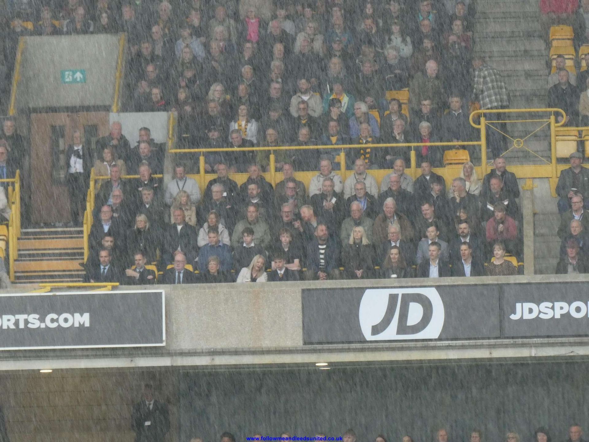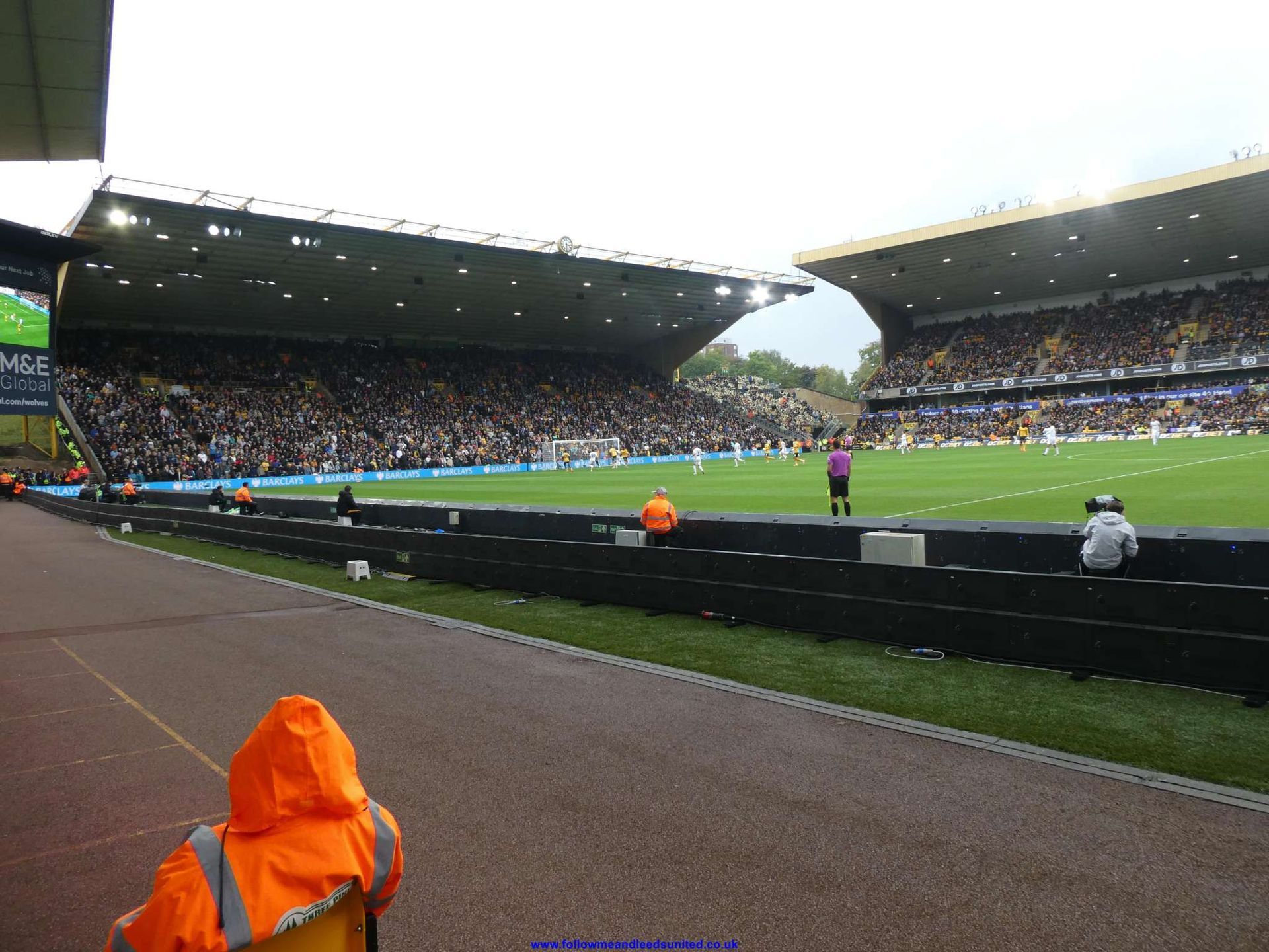 When I saw the weather from under the stand, I was dreading being on the front row getting soaked but had a pleasant surprise. Well done to Wolves for having the roof far enough out to prevent this. At one point, I had to lean forward to let people pass to get out of the row and I had visions of going head over the wall and landing on the ground in front of me. It brought back reminisces of me being in that position with 8 girls battering me at a Donny Rovers preseason friendly at Belle Vue where I did indeed end up on the side of the pitch, as the lad next to me pushed me over the wall to get me away from them. I’m glad to say I did stay in the stand today thankfully.